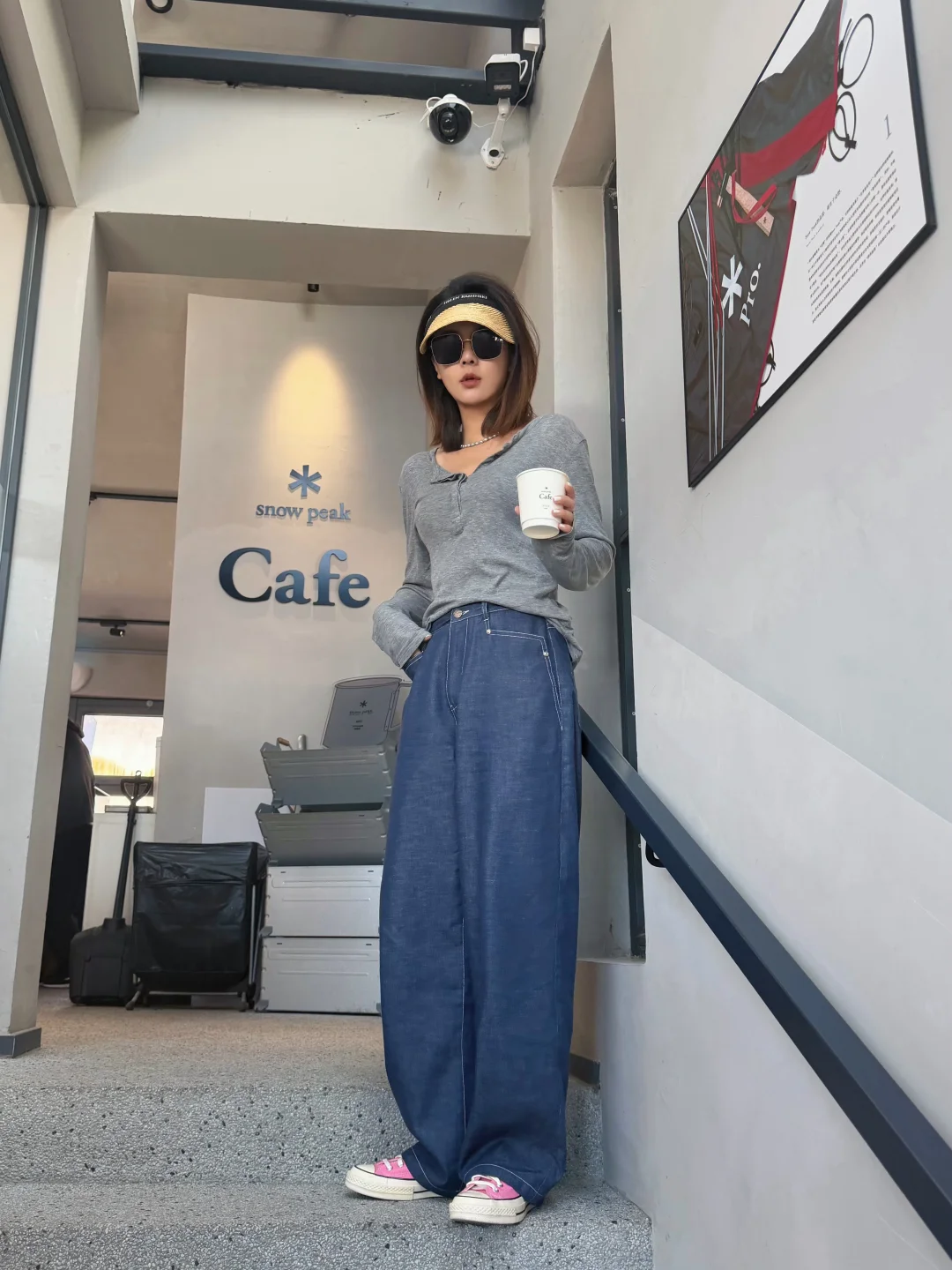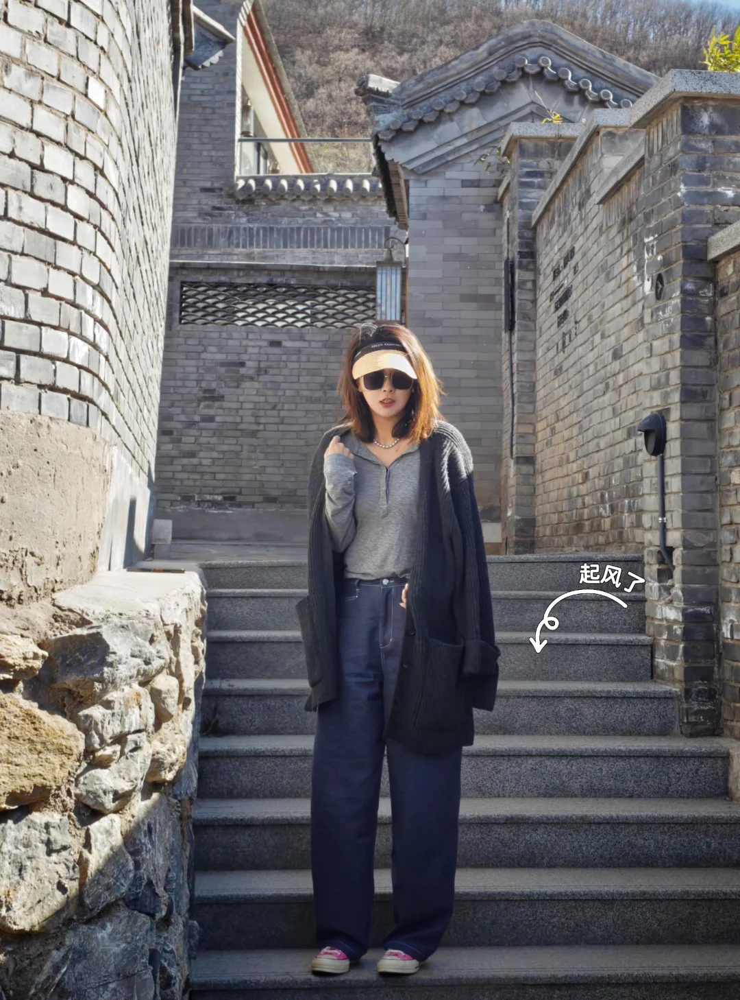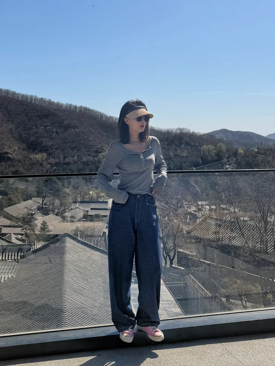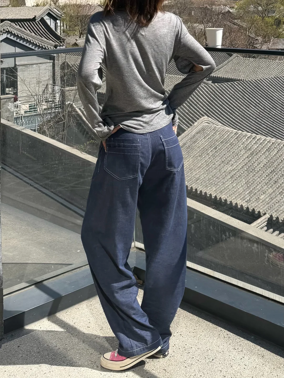 一件灰调亨利衫,搭配一条明线阔腿牛仔裤。