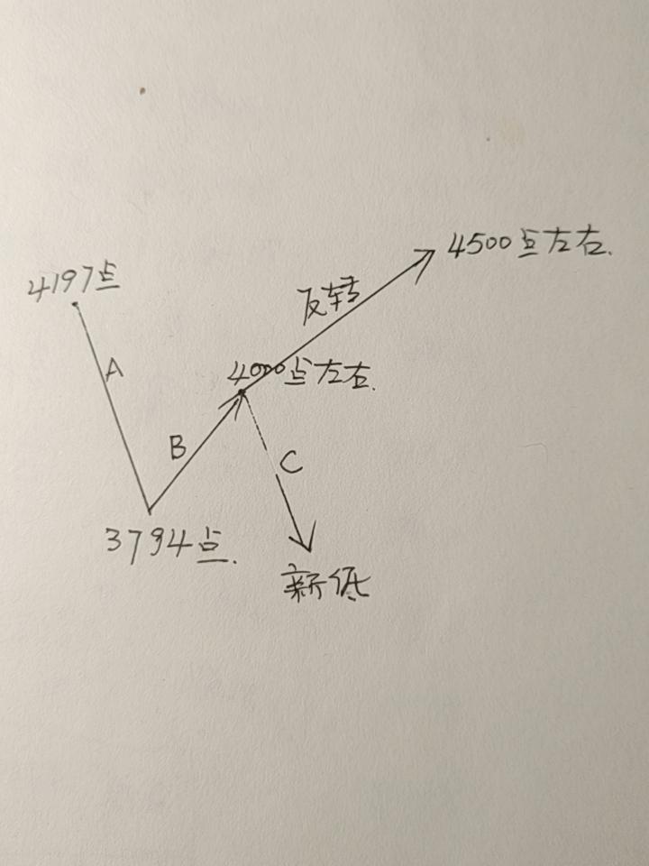 1:看下面的截图5,我又画了一个上证指数走势预演图,从4197点至3794点是a浪下跌,从3794点至现在是b浪反弹中,B浪高点是在4043点下方,反弹结束以后继续下跌,再创3794点新低。