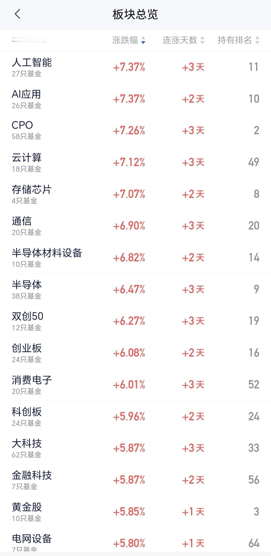 整个市场上涨幅度最大的三个板块是:人工智能板块,AI应用板块,cpo板块,下跌幅度最大的三个板块是:煤炭板块,油气资源板块,海外医药板块。