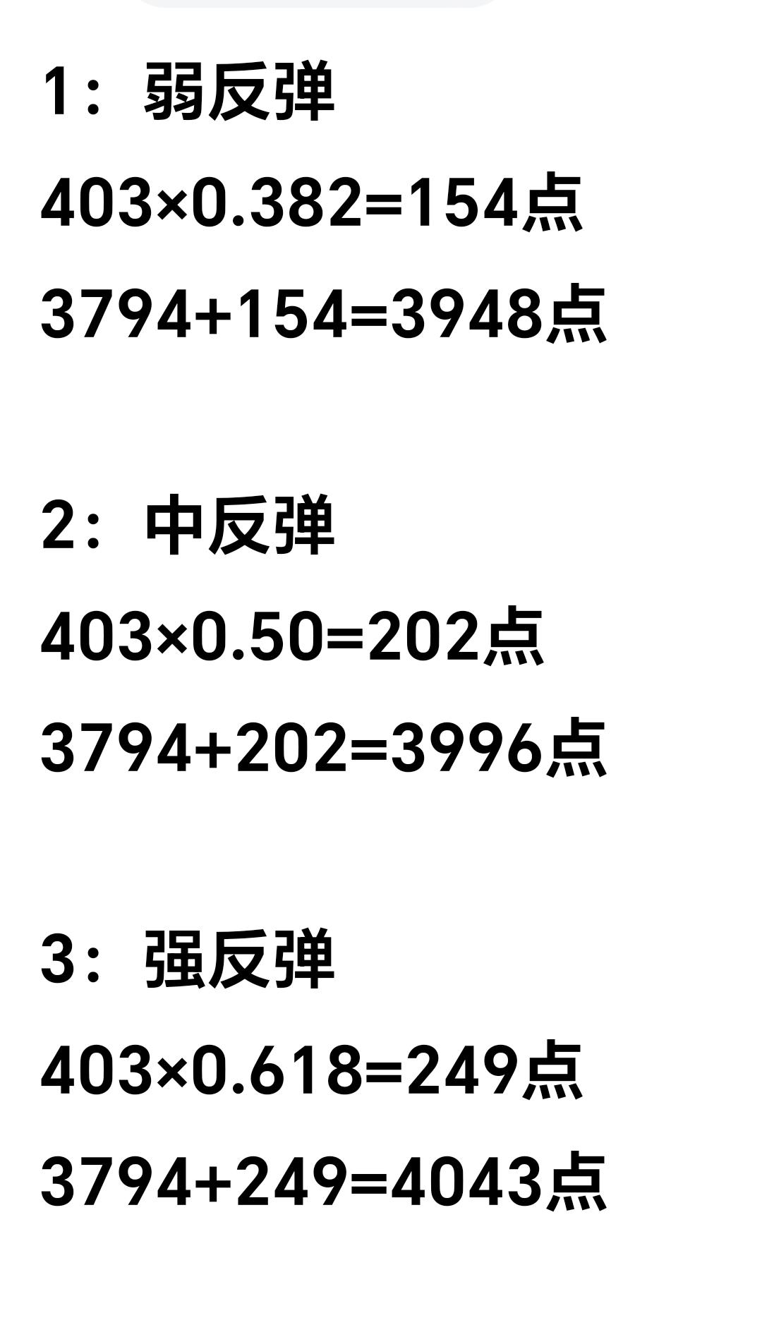 今天的收盘点位3995点,正好收在中反弹3996点的附近,如果近几天继续上涨,市场反转的可能性就越来越大,如果近几天震荡回落,反弹的概率就大增,弱反弹、中反弹和强反弹的各自点位见下面的截图4,也可以去上一篇文章观看点位来源。