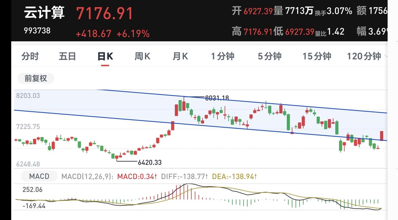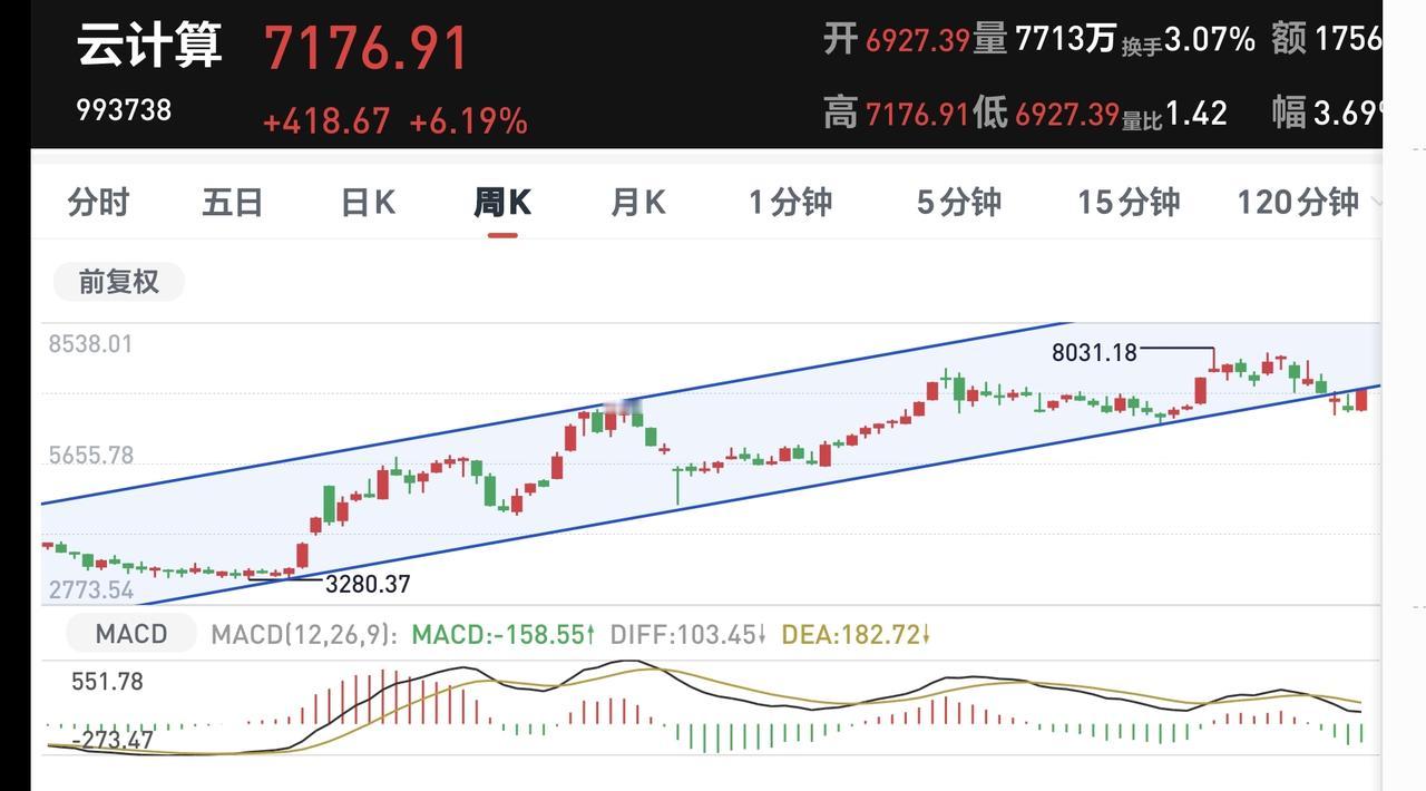 云计算板块周线级别处于上涨趋势破位中,今天的上涨来到了这个上涨通道下轨线附近,近期观察能不能继续上涨再次回到这个上涨通道内,如果能够回到这个上涨通道内,长线持有的人可以继续持有。