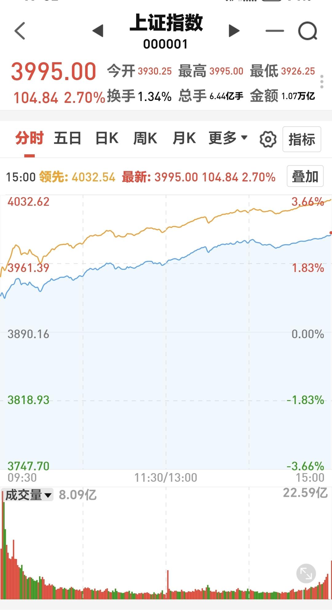 今天市场高开高走,收盘的时候三大指数都是大涨,创业板指上涨了5.91%,收于3347点,上证指数上涨了2.70%,收于3995点。