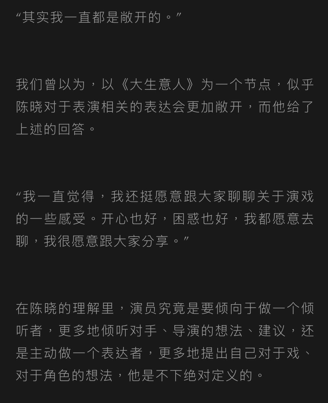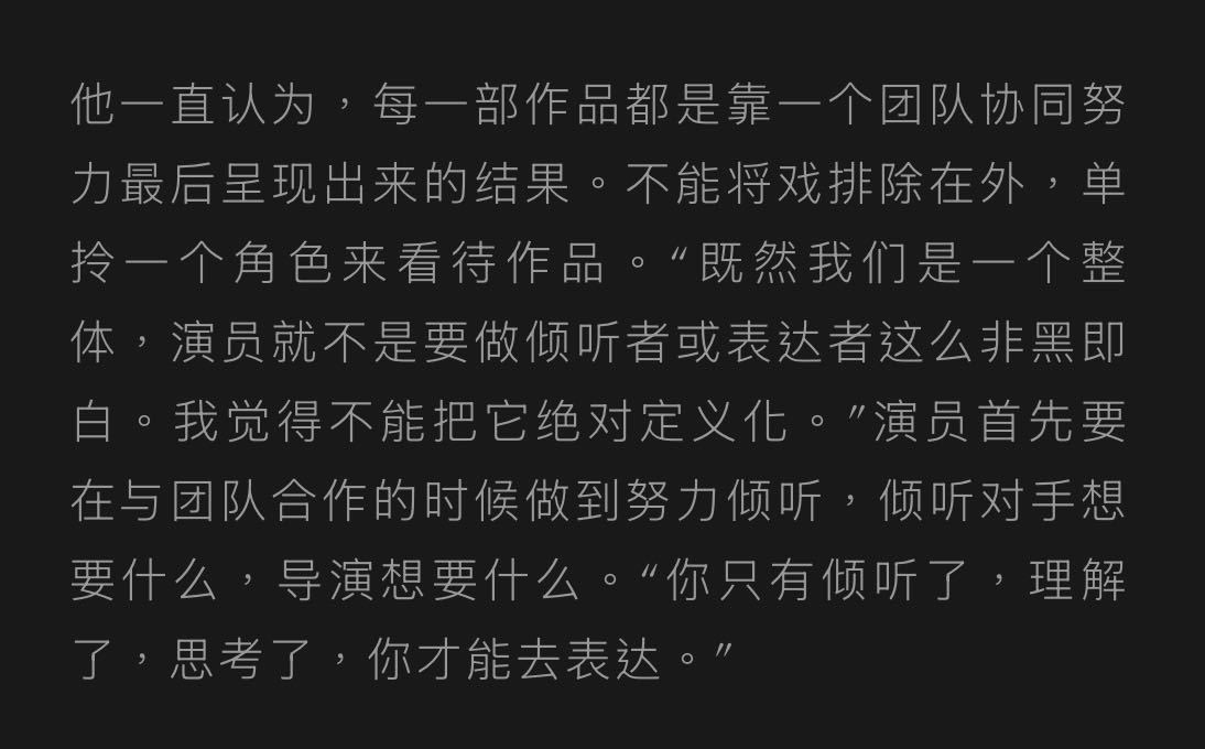 “其实我一直是敞开的”“演员就不是要做倾听者或表达者这么非黑即白,不能把它绝对定义化”“你只有倾听了,理解了,思考了,你才能去表达”陈晓 身上完全呈现出一个品质演员不断沉淀、不断内化、不断进步的过程。他内敛,低调,却又是片场里友好慷慨的那个合作对象,尊重每个人的意见与思考。都是好演员都是理解力与共情力超群的存在,陈晓亦是如此吧。真心诚意地靠近角色,脚踏实地演好每一场戏,这种有内涵的好演员实在是我们观众的福气😭