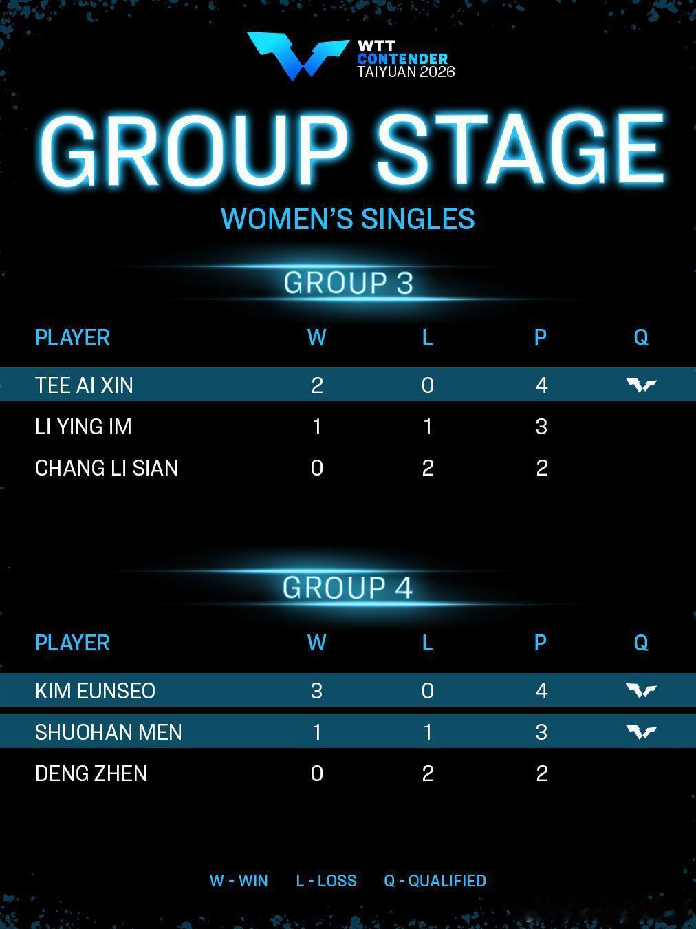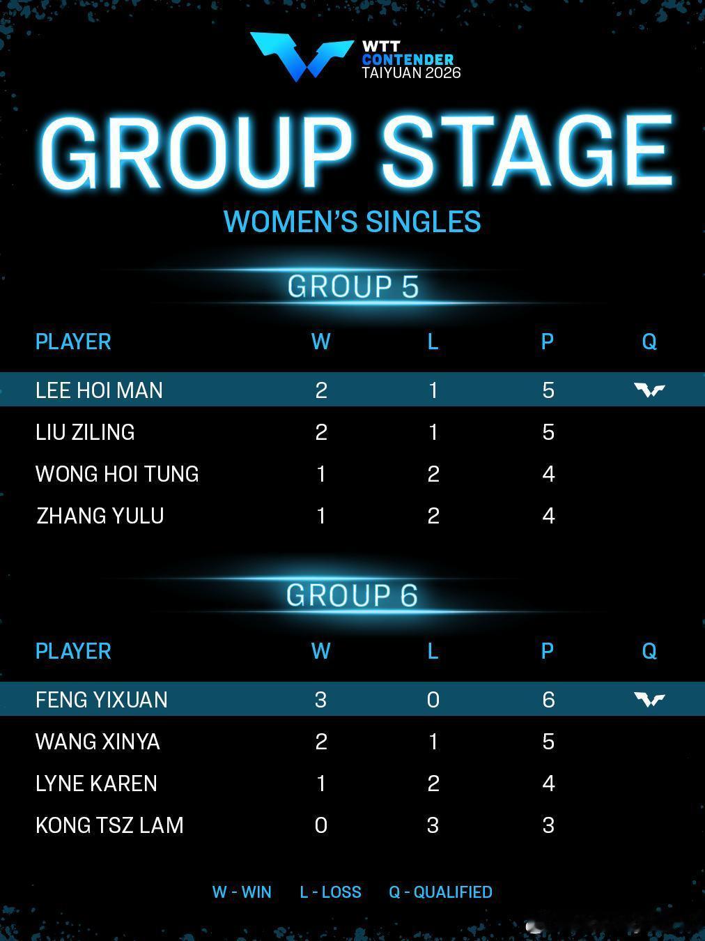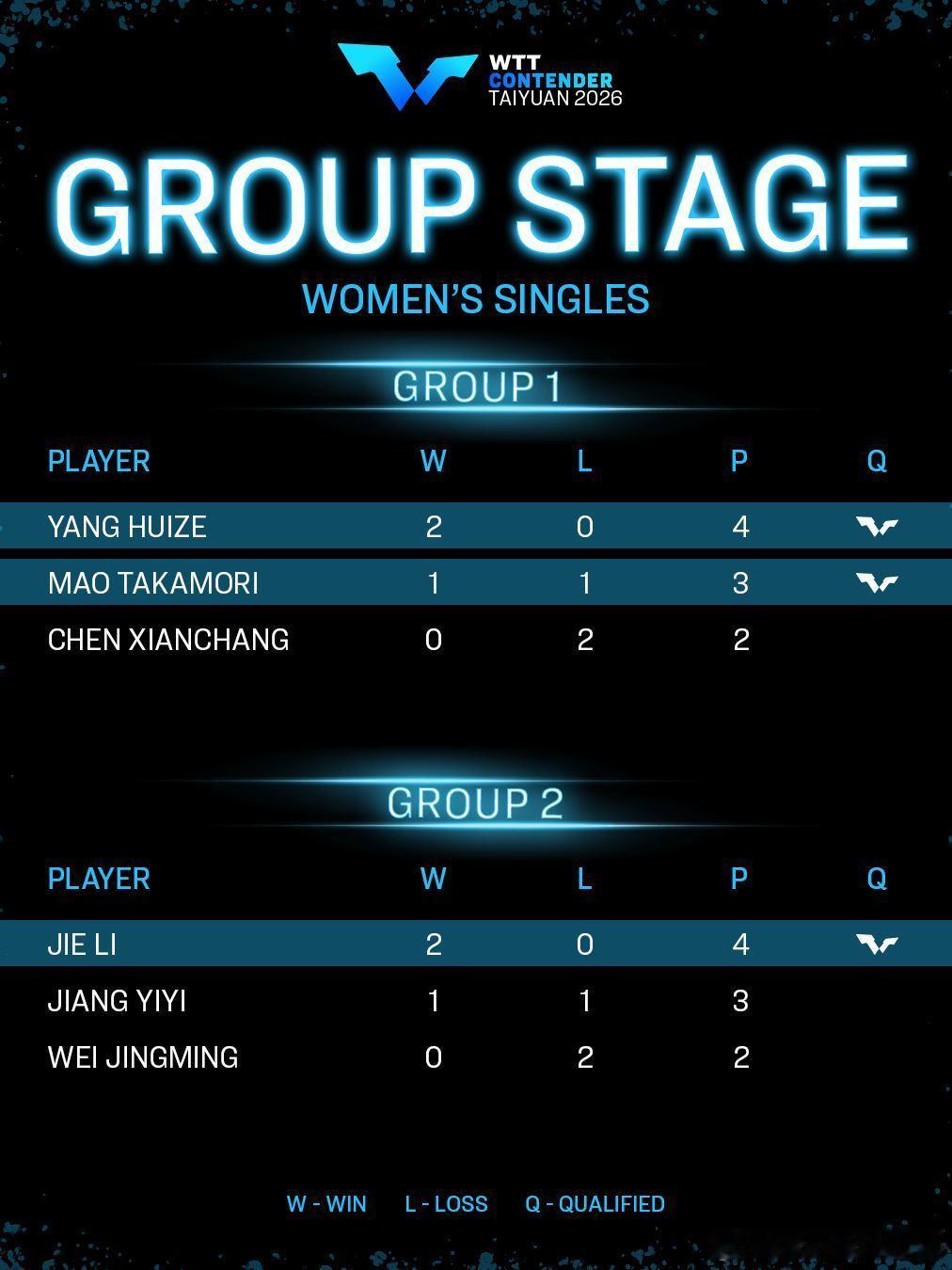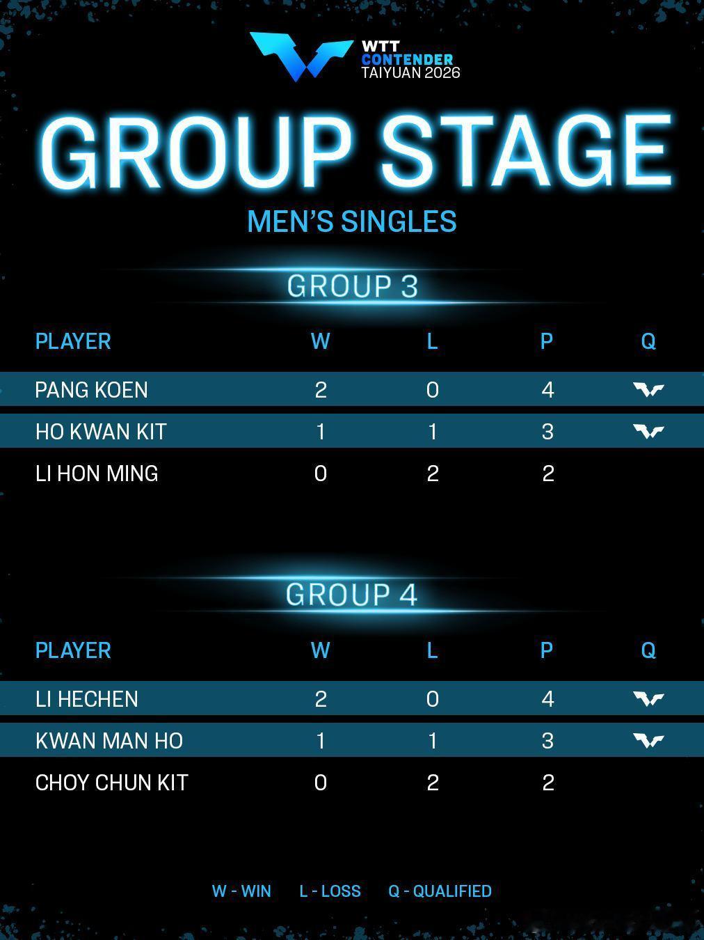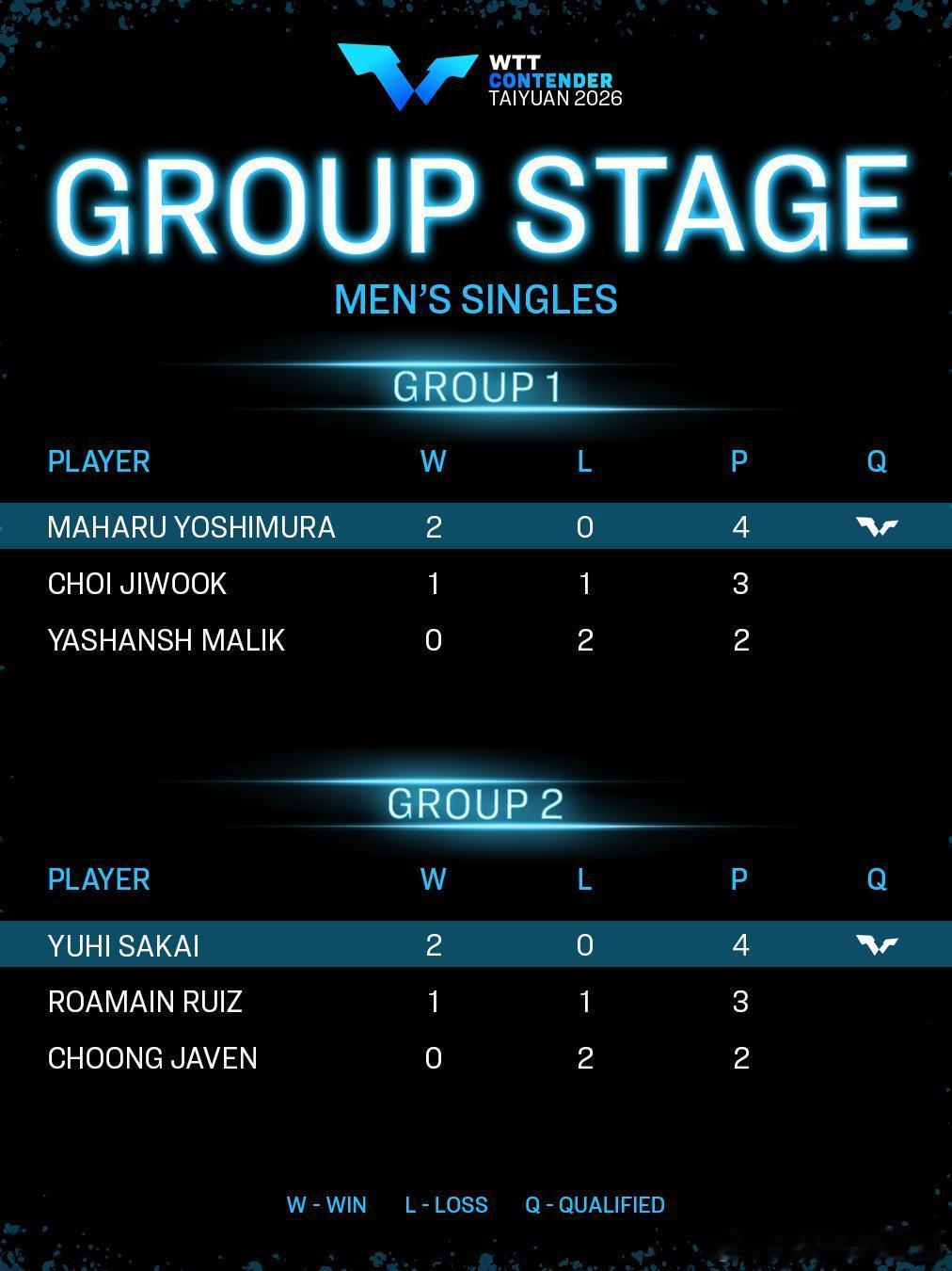 WTT常规挑战赛太原站2026 资格赛小组赛出线晋级正赛的选手
