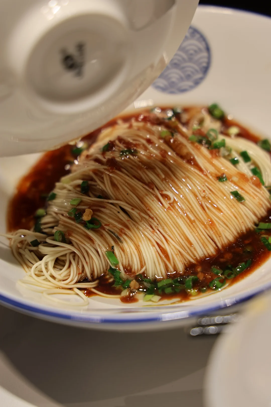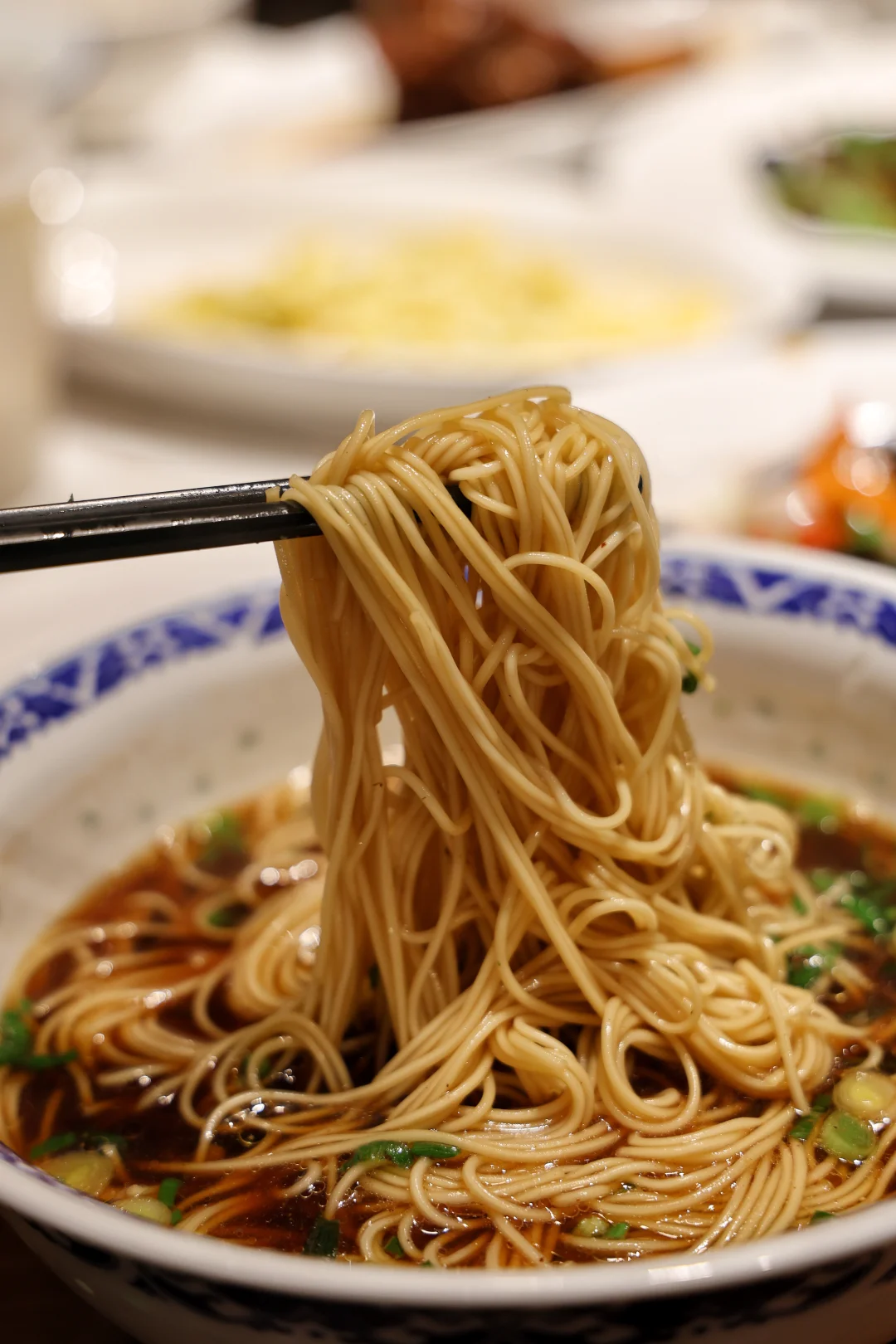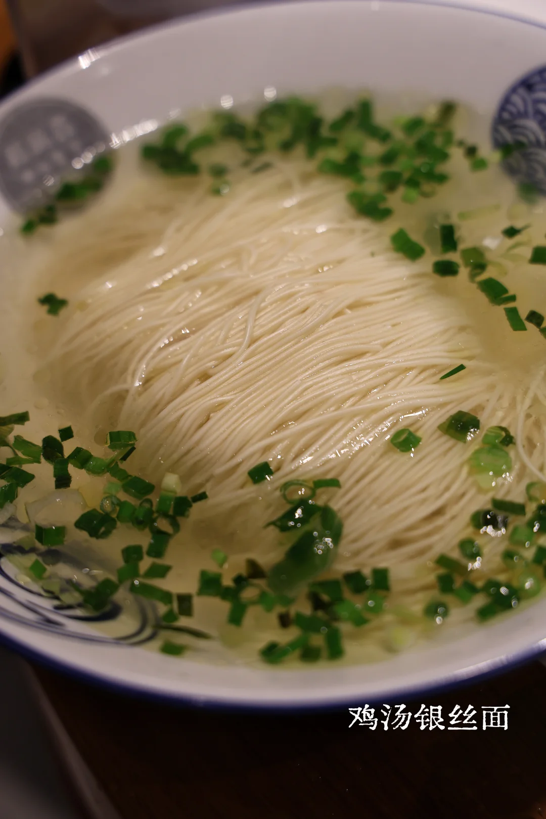 1. 鸡汤银丝面:不愧是店里的“三宝”之一,非遗认证果然有底气!面条细如银丝,根根分明且韧劲十足,下锅煮后也不会软烂坨在一起。鸡汤底清鲜醇厚,没有过多的调料味,只撒了一把葱花提香,喝起来温润爽口,每一口面都裹着淡淡的鸡汤鲜味,简单却极具风味。