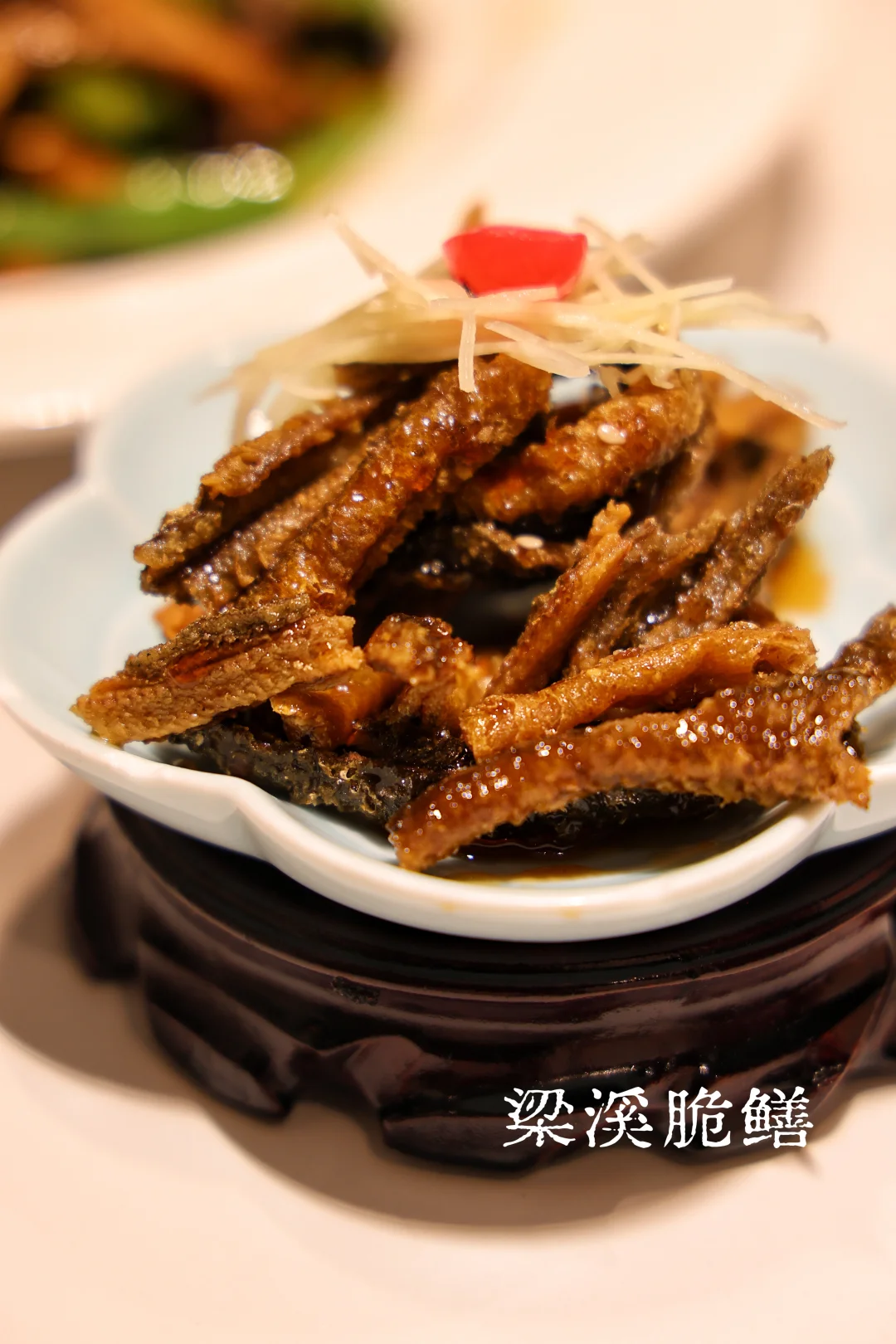 1. 梁溪脆鳝:无锡名菜的排面是有的,色泽酱红诱人。鳝鱼炸得通体酥脆,连骨头都炸得软烂可嚼,裹着甜咸交织的酱汁,入口酥香回甘,风味很正宗。美中不足的是分量实在太少,摆盘精致却略显“迷你”,同行4人一人一筷子就见底了。