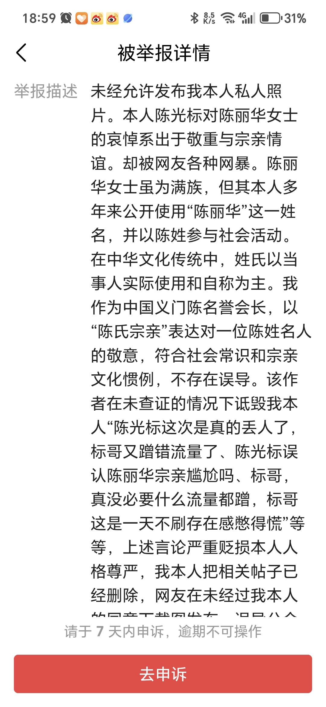 本人陈光标对陈丽华女士的哀悼系出于敬重与宗亲情谊。却被网友各种网暴。陈丽华女士虽为满族,但其本人多年来公开使用“陈丽华”这一姓名,并以陈姓参与社会活动。在中华文化传统中,姓氏以当事人实际使用和自称为主。我作为中国义门陈名誉会长,以“陈氏宗亲”表达对一位陈姓名人的敬意,符合社会常识和宗亲文化惯例,不存在误导。该作者在未查证的情况下诋毁我本人“陈光标这次丢人了?标哥又蹭错流量了,陈光标误认陈丽华宗亲尴尬吗?标哥真的没必要什么流量都蹭”等等,上述言论严重贬损本人人格尊严,我本人把相关帖子已经删除,网友在未经过我本人的同意下截图发布,误导公众认为本人虚伪炒作,损害本人多年慈善公益形象。依据《民法典》第1024条,请求平台删除相关侵权评论。”