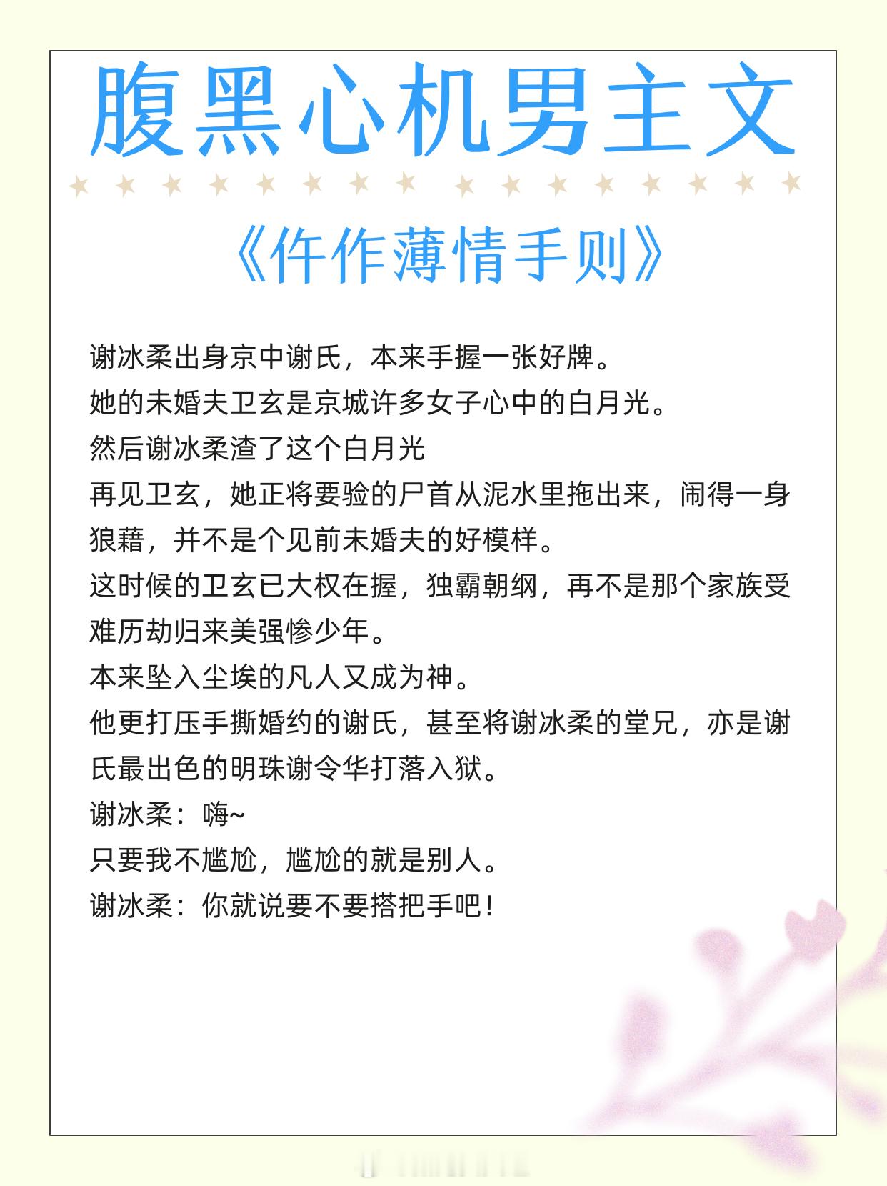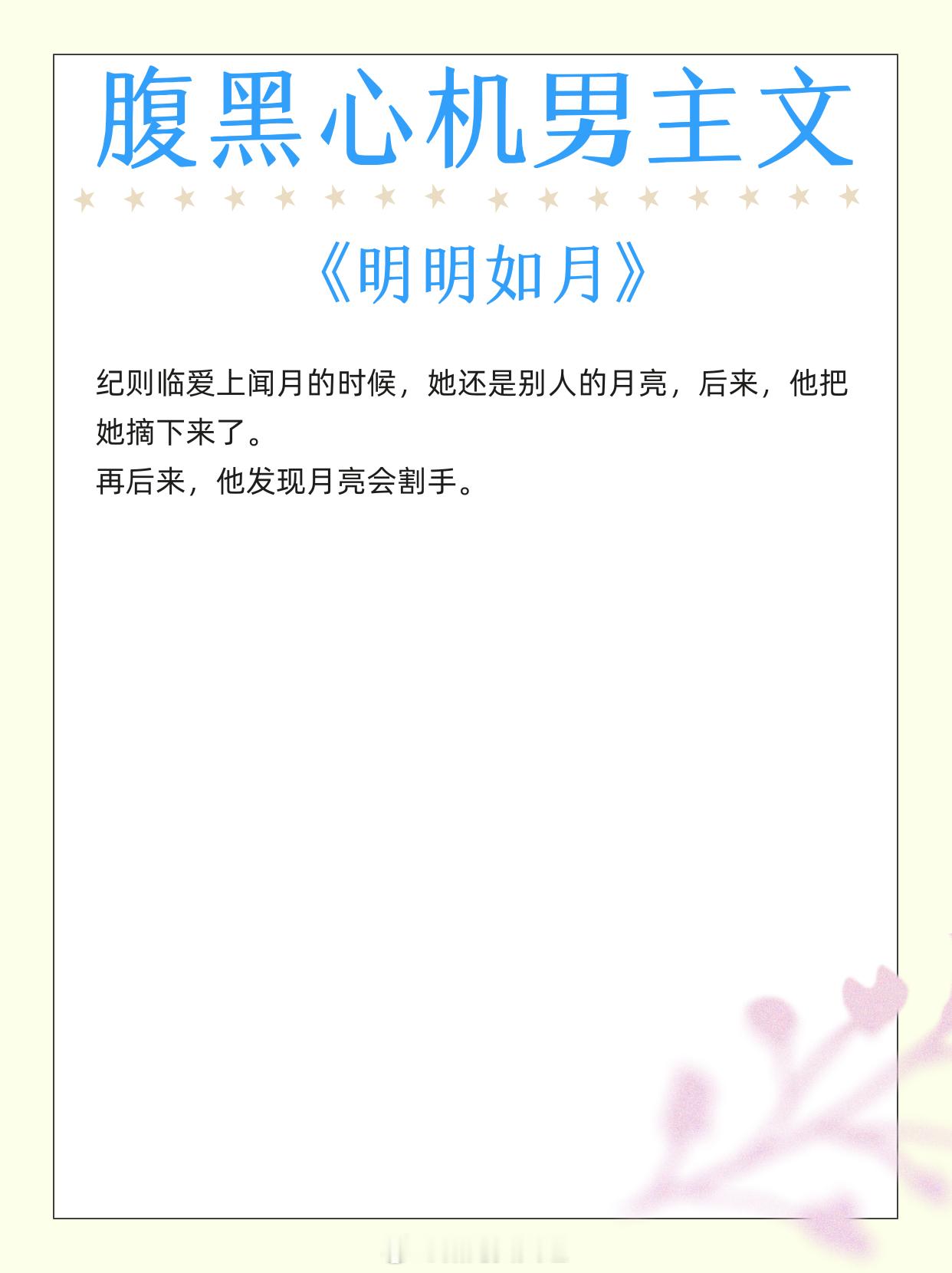 腹黑心机男主文,步步为营俘获女主心!1、《锦宫春暖》作者:女王不在家2、《九零光荣军嫂》作者:春未绿3、《仵作薄情手则》作者:柯小聂4、《徒手摘星》作者:雾枝桃5、《思无涯》作者:翘摇6、《明明如月》作者:叹西茶哪本小说能让你重刷n遍 我的私人宝藏书单
