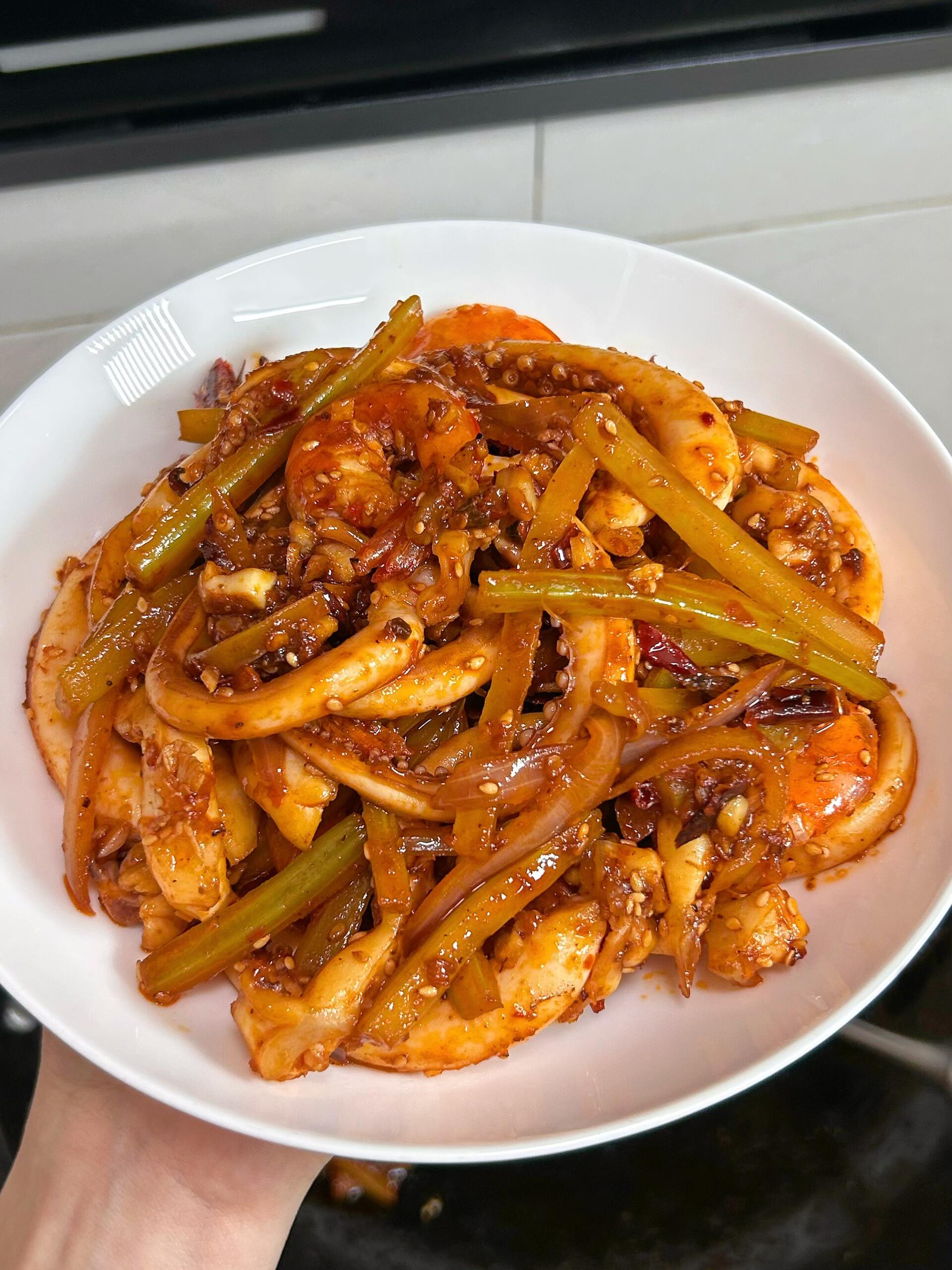 真的巨巨巨香🤤 大虾外焦里嫩,咬一口满是鲜香,鱿鱼Q弹劲道,裹着香辣酱汁,每一口都层次拉满,麻辣干香不腻口,配米饭能直接炫3碗!