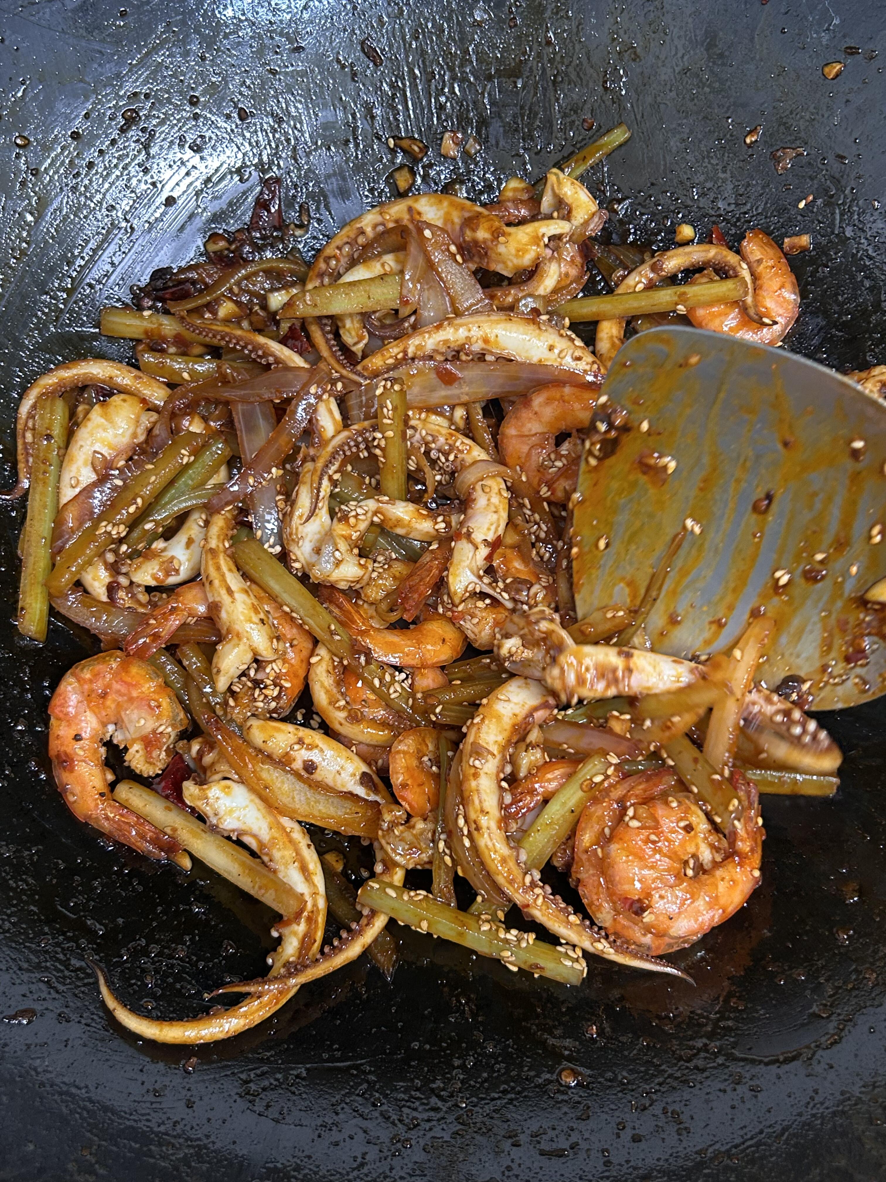 3️⃣ 锅里不用额外放油,放入香锅调味包、适量干辣椒,再加入洋葱、芹菜、蒜粒,小火慢慢翻炒,炒出浓郁的香味,然后倒入处理好的鱿鱼须和大虾,快速翻炒均匀,最后撒上白芝麻,关火就能开吃啦!