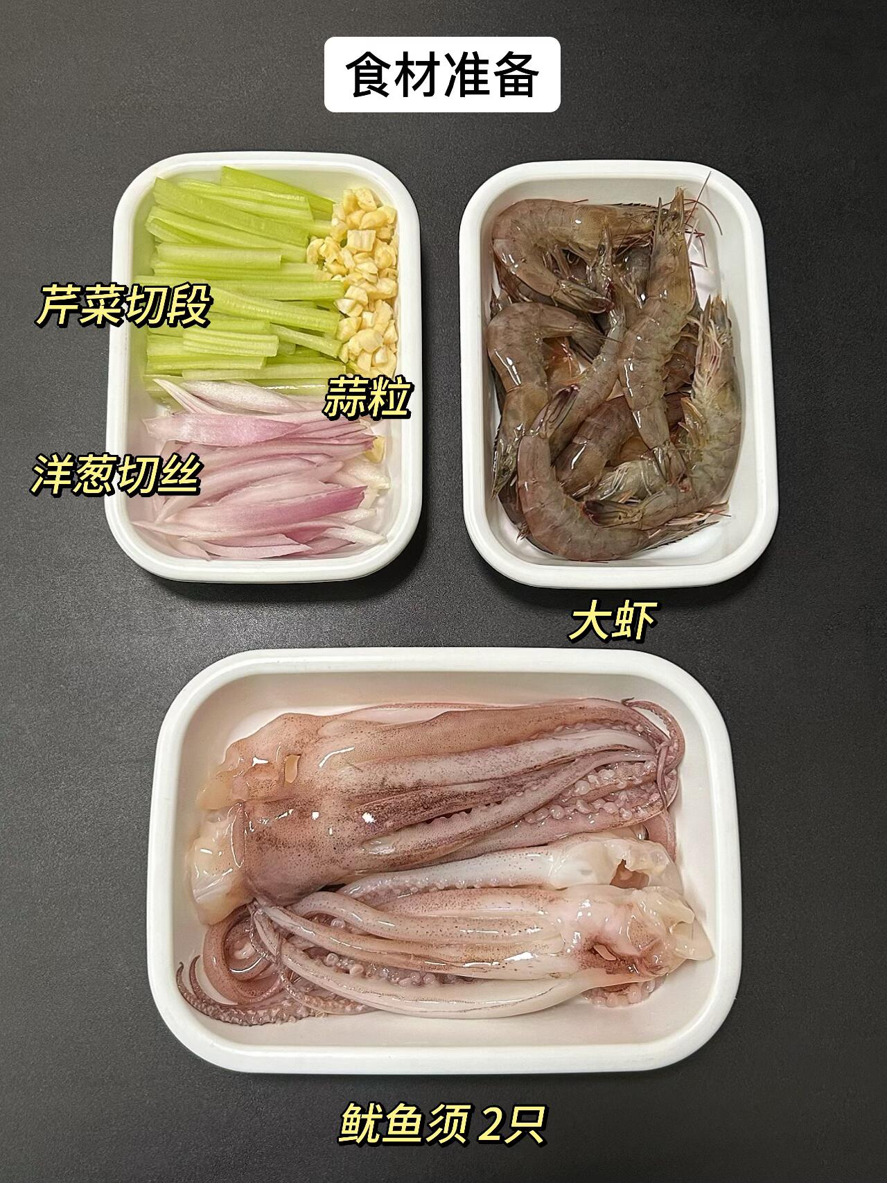 鱿鱼须、大虾、洋葱、芹菜、蒜粒(食材简单常见,菜市场随手就能买到,不用特意囤货)