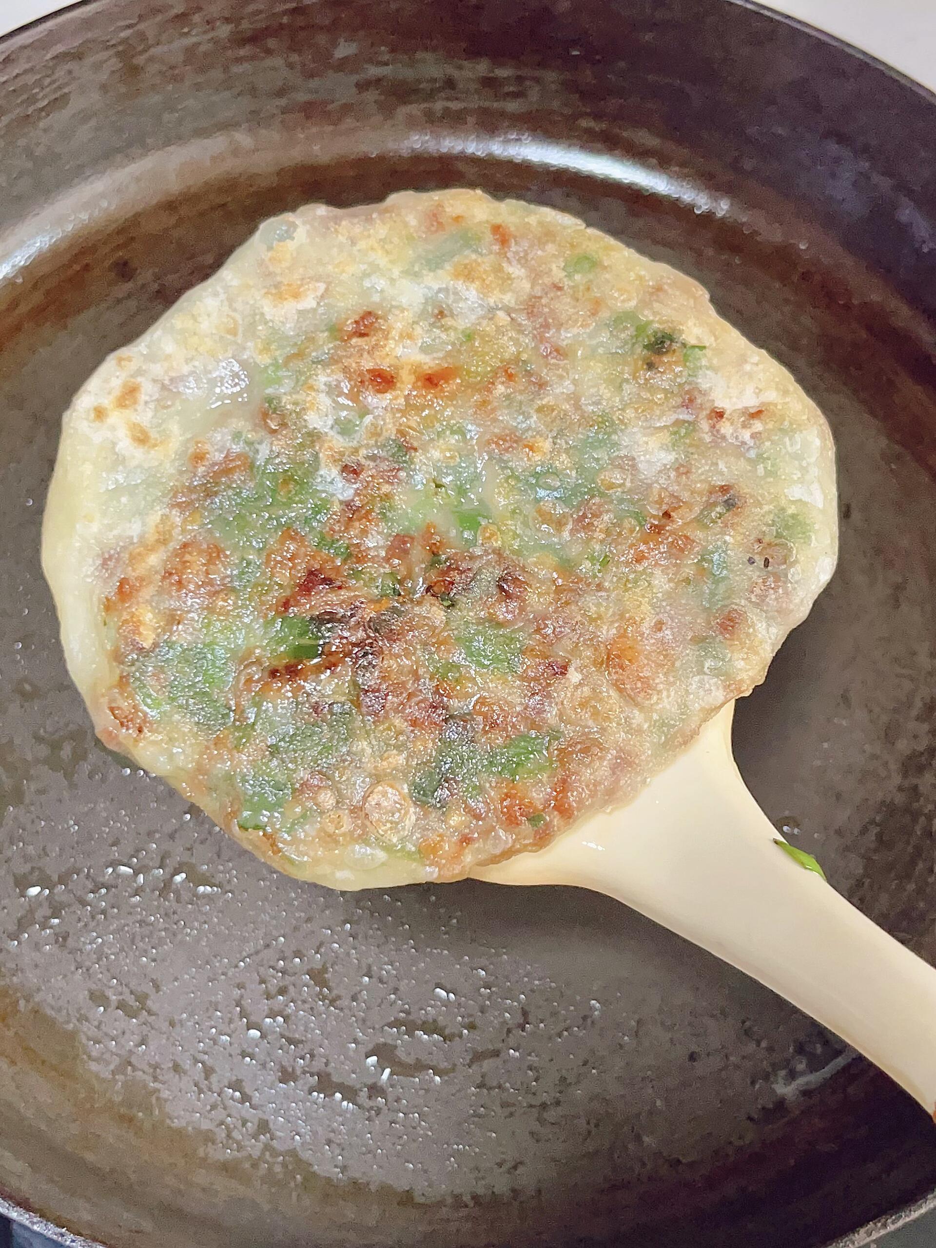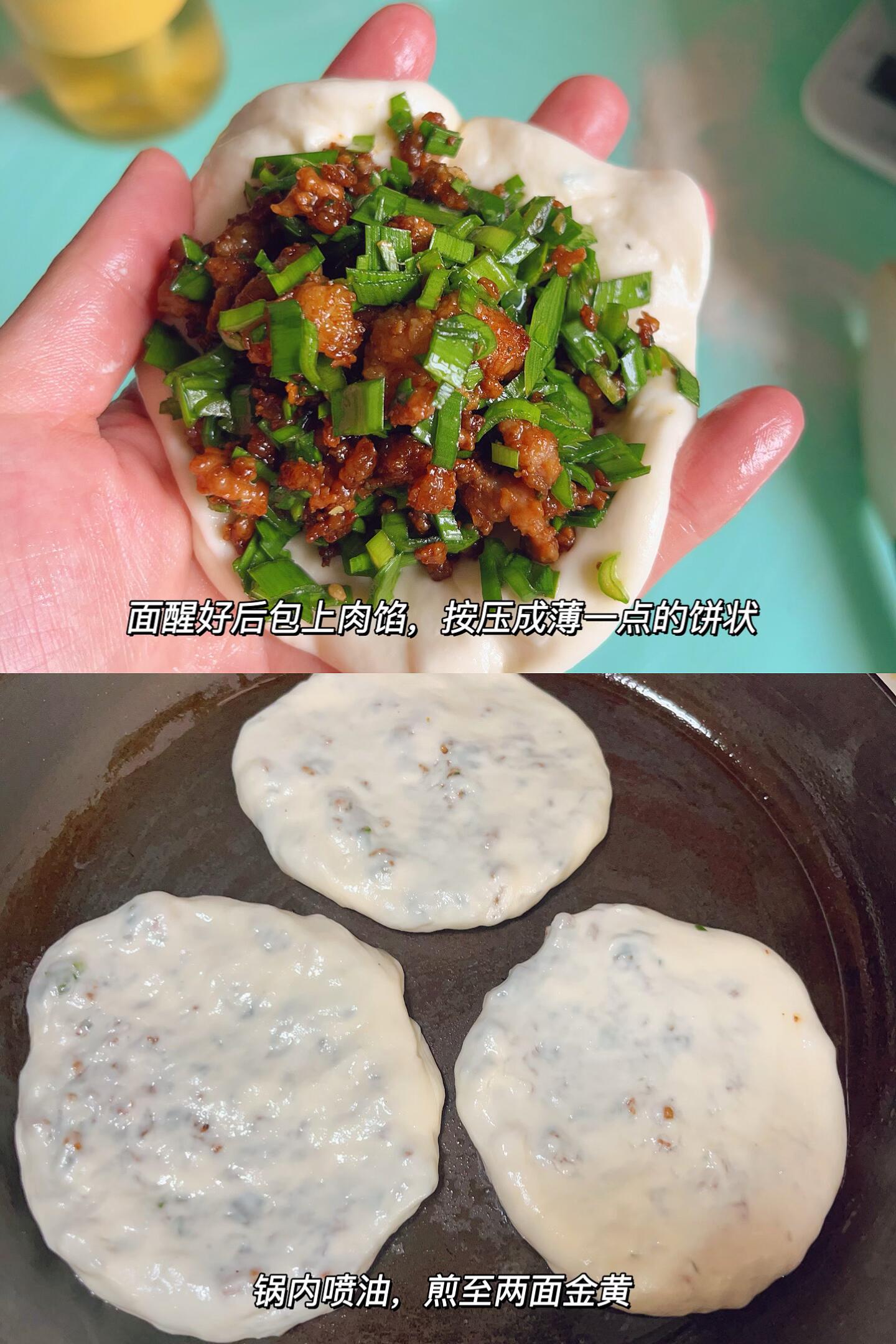 4⃣️ 取一个醒好的面球,用手掌压扁,包上适量调好的馅料,捏紧封口,再轻轻按扁成小饼状;锅内喷一层油,油热后放入肉饼,中小火慢慢煎,煎至两面金黄,按压饼皮有弹性,就可以出锅啦!