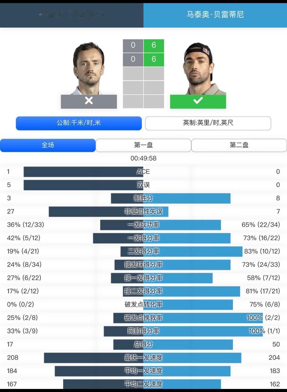 从赛后的统计可以看出,梅总在总共12局里面也就拿了17分,平均一局拿1.5个分。而对手贝雷蒂尼在12局里面也就拿了50分,平均一局正好4分多一点,可以说得分非常经济实惠,到了4分就收下了比赛,梅总毫无还手之力!