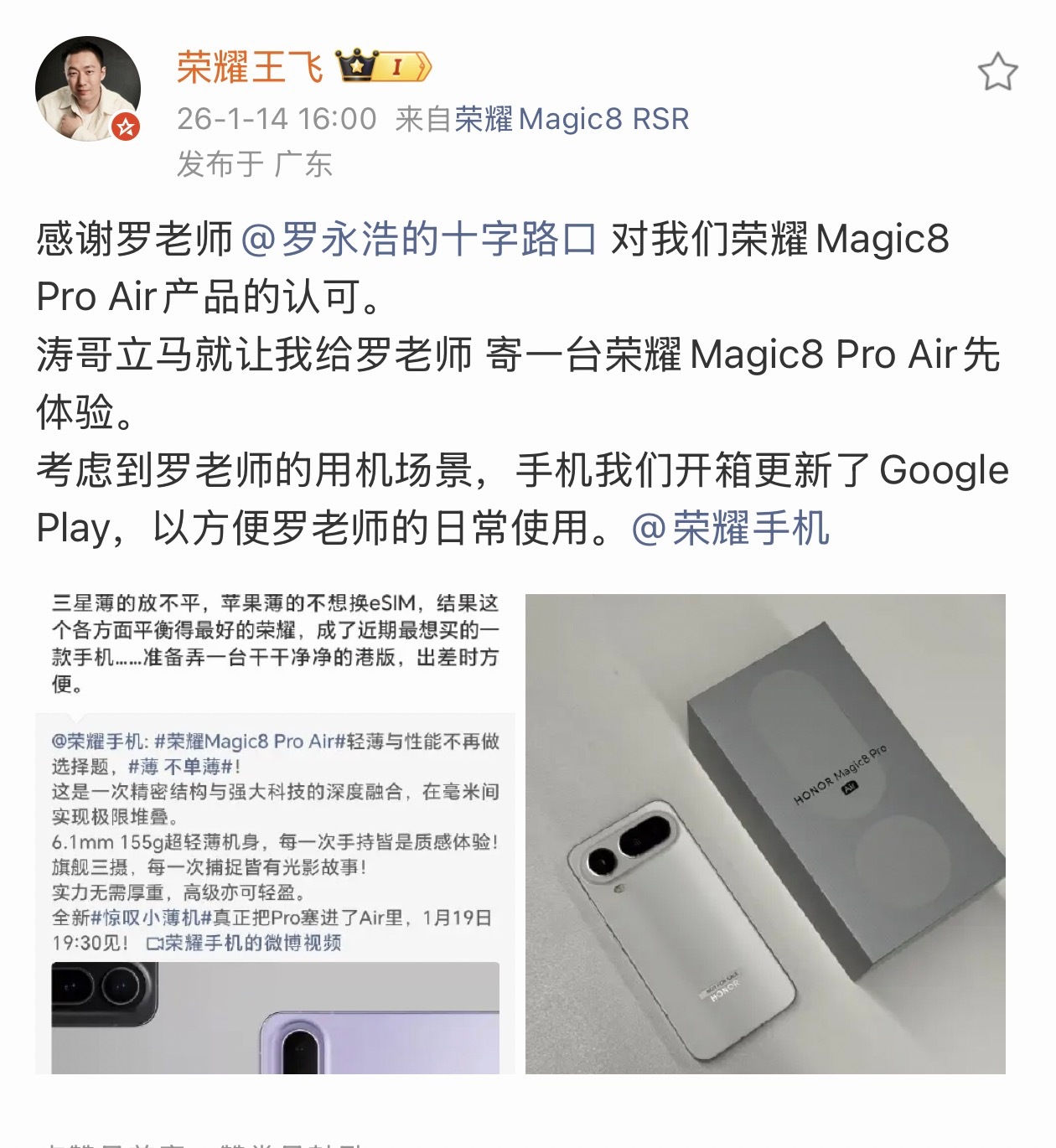 再加上前段时间罗老师关注到荣耀Magic 8 Pro Air,荣耀这边第二天就给罗老师寄过去了。