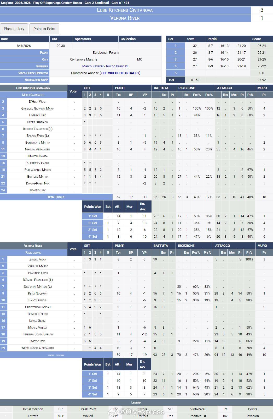 【意超男排半决赛II鲁贝3-1维罗纳 总分1-1】国际排坛战报速递 4月8日奇维塔诺瓦,意超男排半决赛第二回合,奇维塔诺瓦主场3-1(26-24/25-21/21-25/25-22)力克维罗纳,将总比分扳成1-1平。尼科洛夫18分、波托洛12分、洛普基11分、加久洛10分,凯塔16分、达兰11分、內德尔科维奇10分。