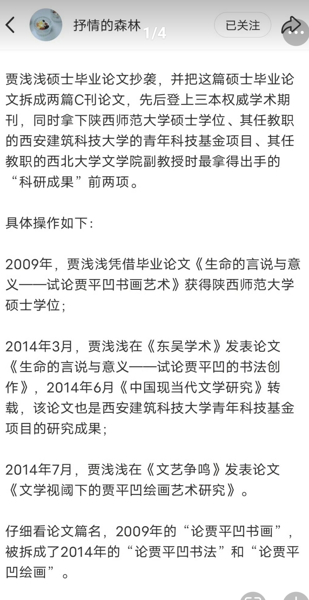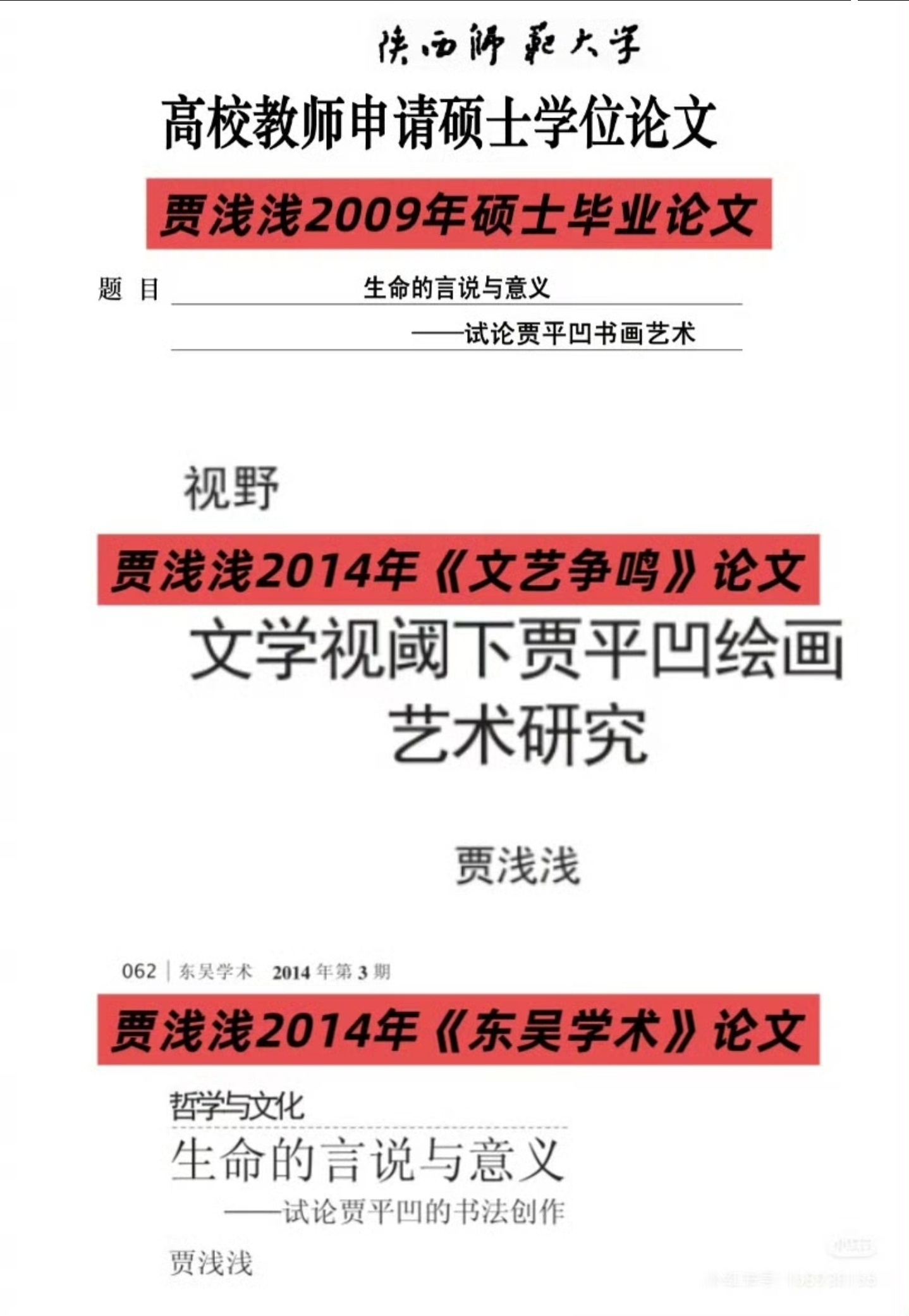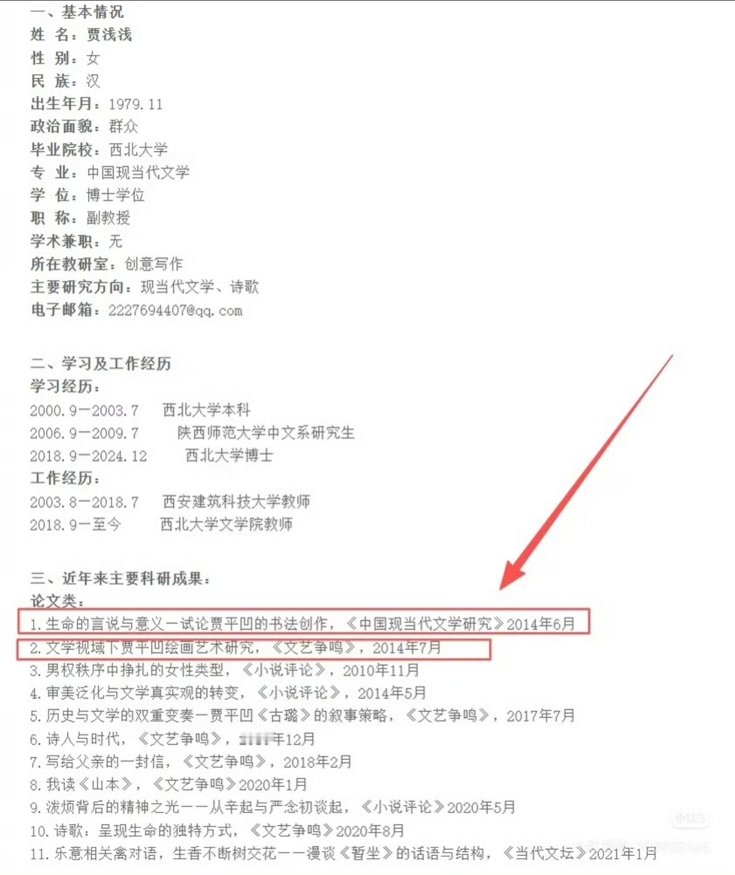 贾浅浅论文调查西北大学出手调查贾浅浅学术争议,终于动真格了吗这几年关于贾浅浅的争议就没断过,“一个坑,一条线”的诗歌梗全网玩烂,她的创作风格一直被骂得狗血淋头,可没想到真正的雷点在学术上。网友扒出她把2009年硕士论文《生命的言说与意义》拆成两篇C刊论文,一篇论书法、一篇论绘画,硬生生把一篇论文“一分为二”凑科研成果,这种操作简直刷新三观!
