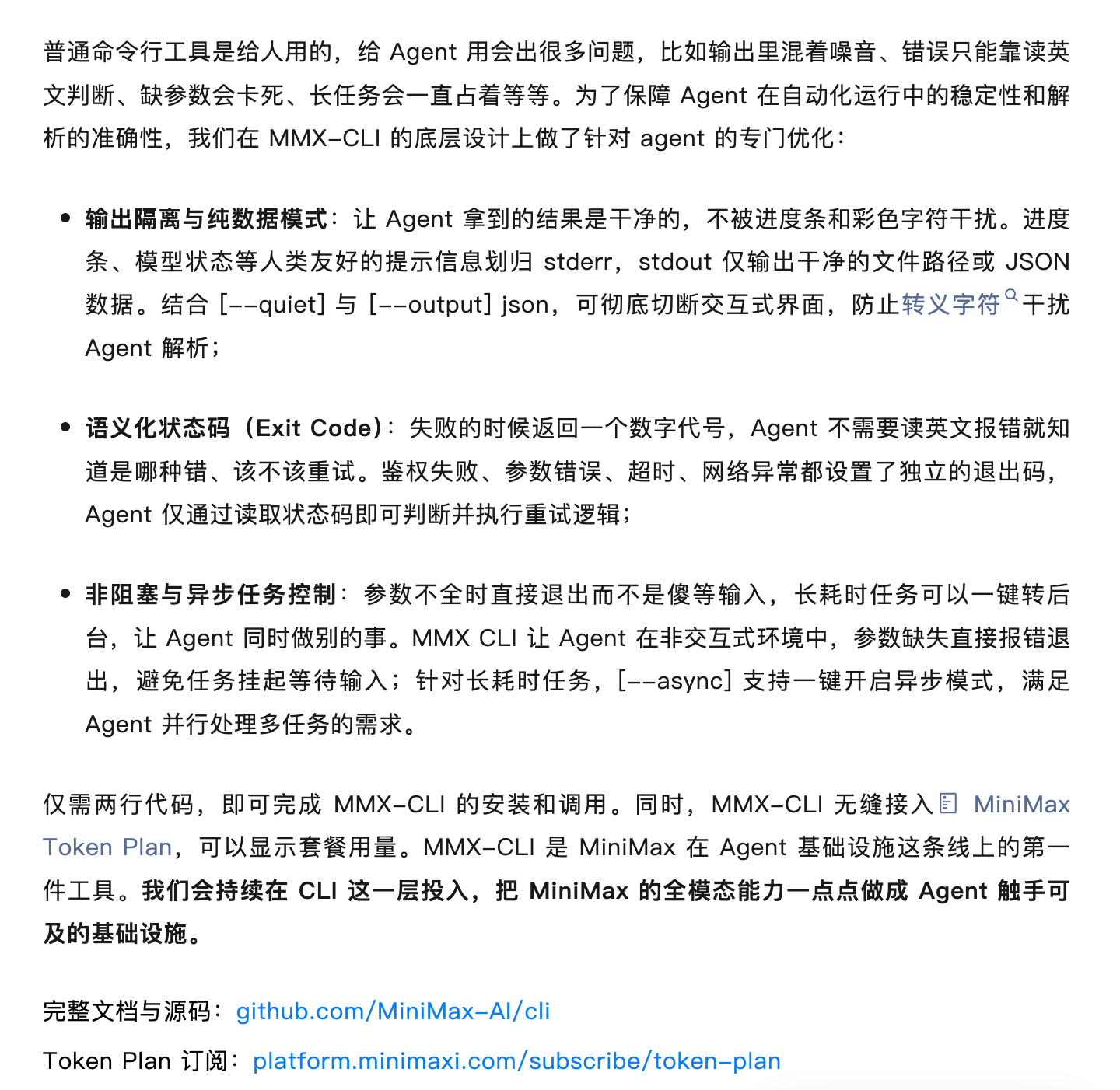 Minimax 发布 MMX-CLI,针对 Agent 的命令行工具地址:git