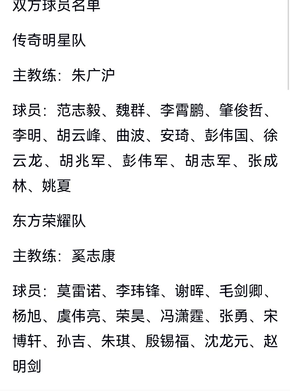 申花十年队长终于要来了!但上海传奇明星队竟然没有海港蔡慧康和吕文君两大名宿!本月上海足坛迎来重磅比赛!对阵双方分别是传奇明星队和东方荣耀!两位主帅分别是朱广沪和奚志康!两方队长分别是球迷期盼已久的莫雷诺个范志毅!我们看到传奇明星对里有很多球队名宿,唯独没有海港名宿!这是有些可惜的!
