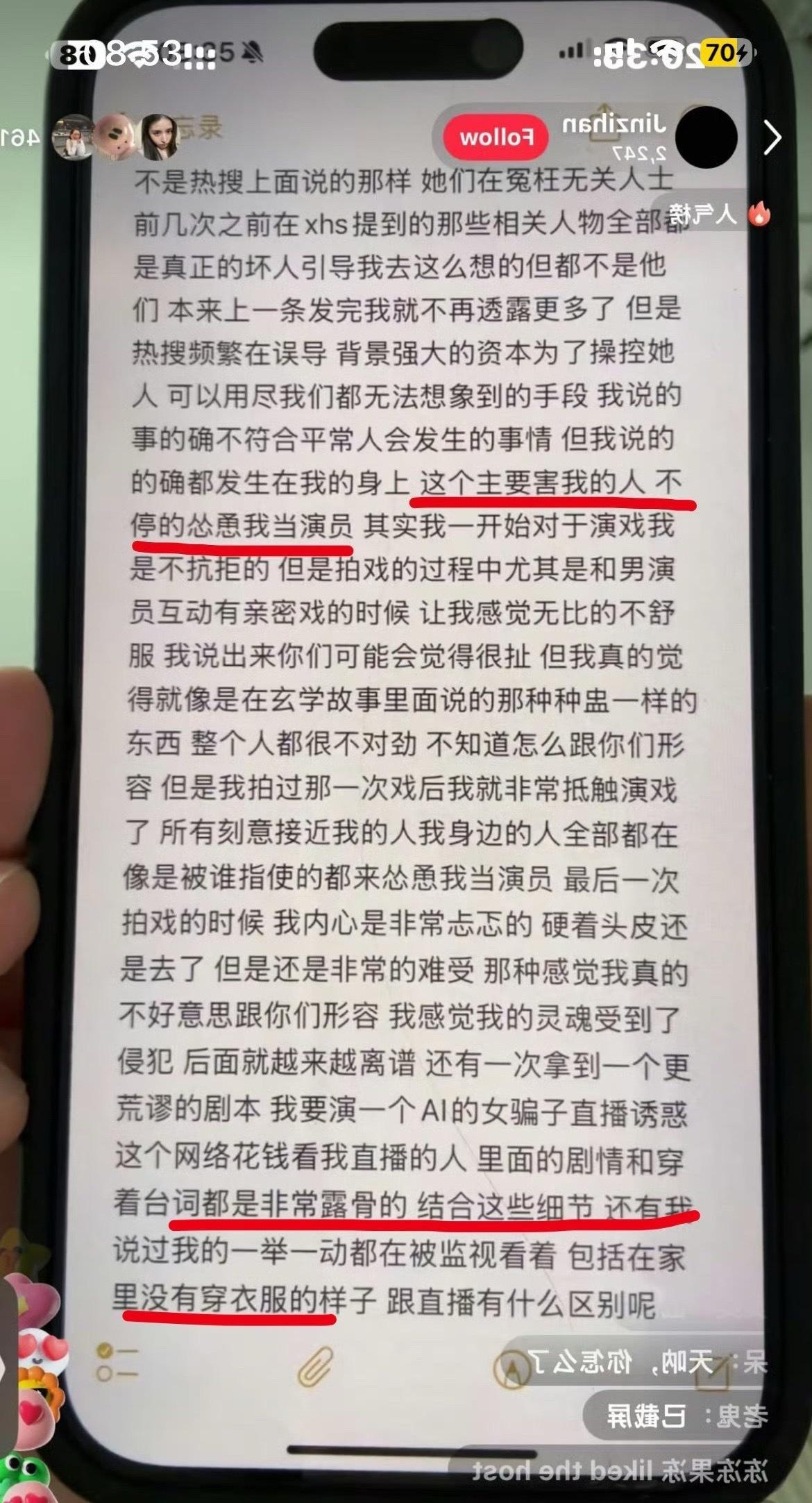 2. 被要求出演露骨的AI女骗子直播诱惑剧本,称自己的一举一动(包括在家的隐私)都被全程监视。
