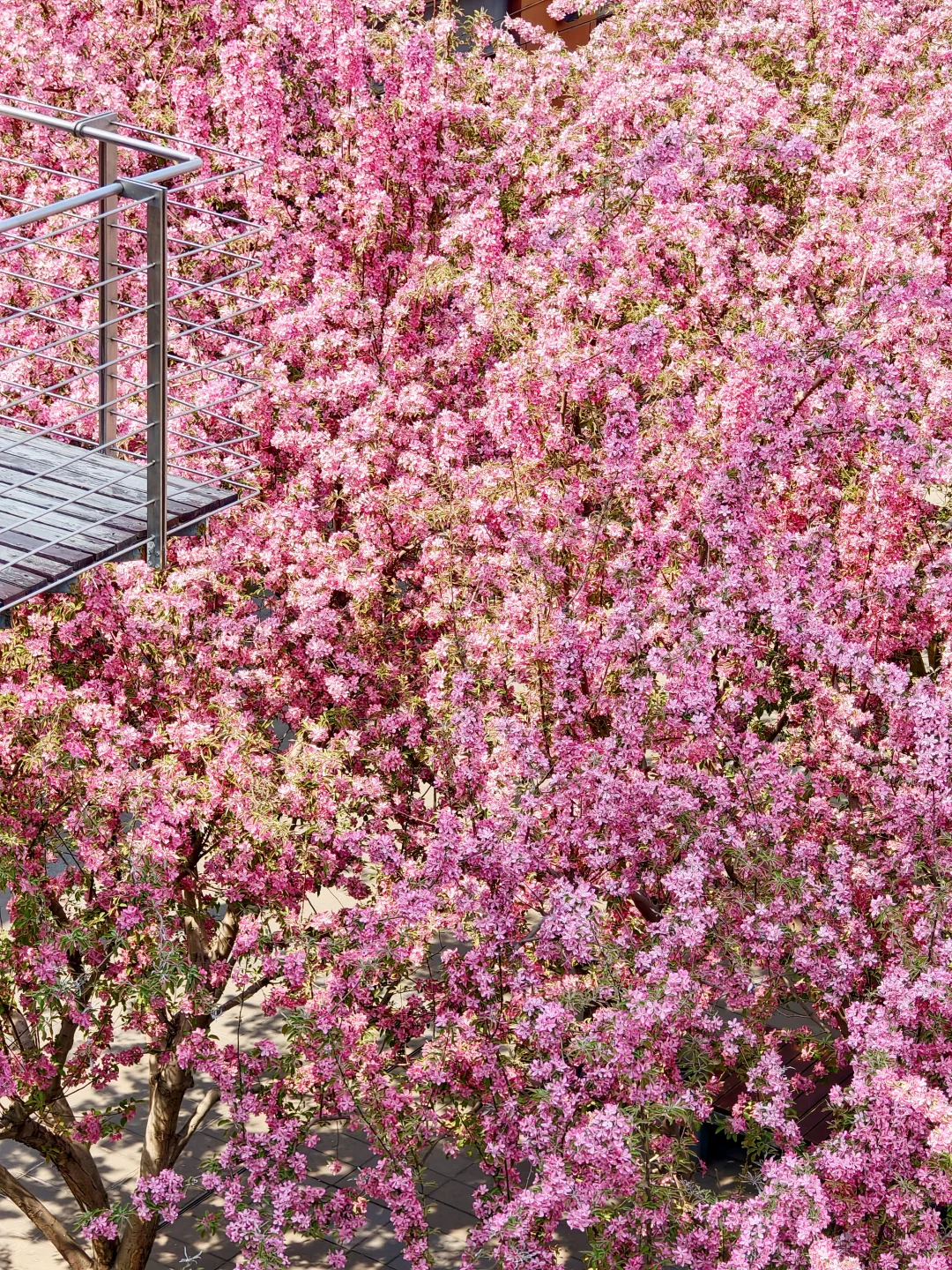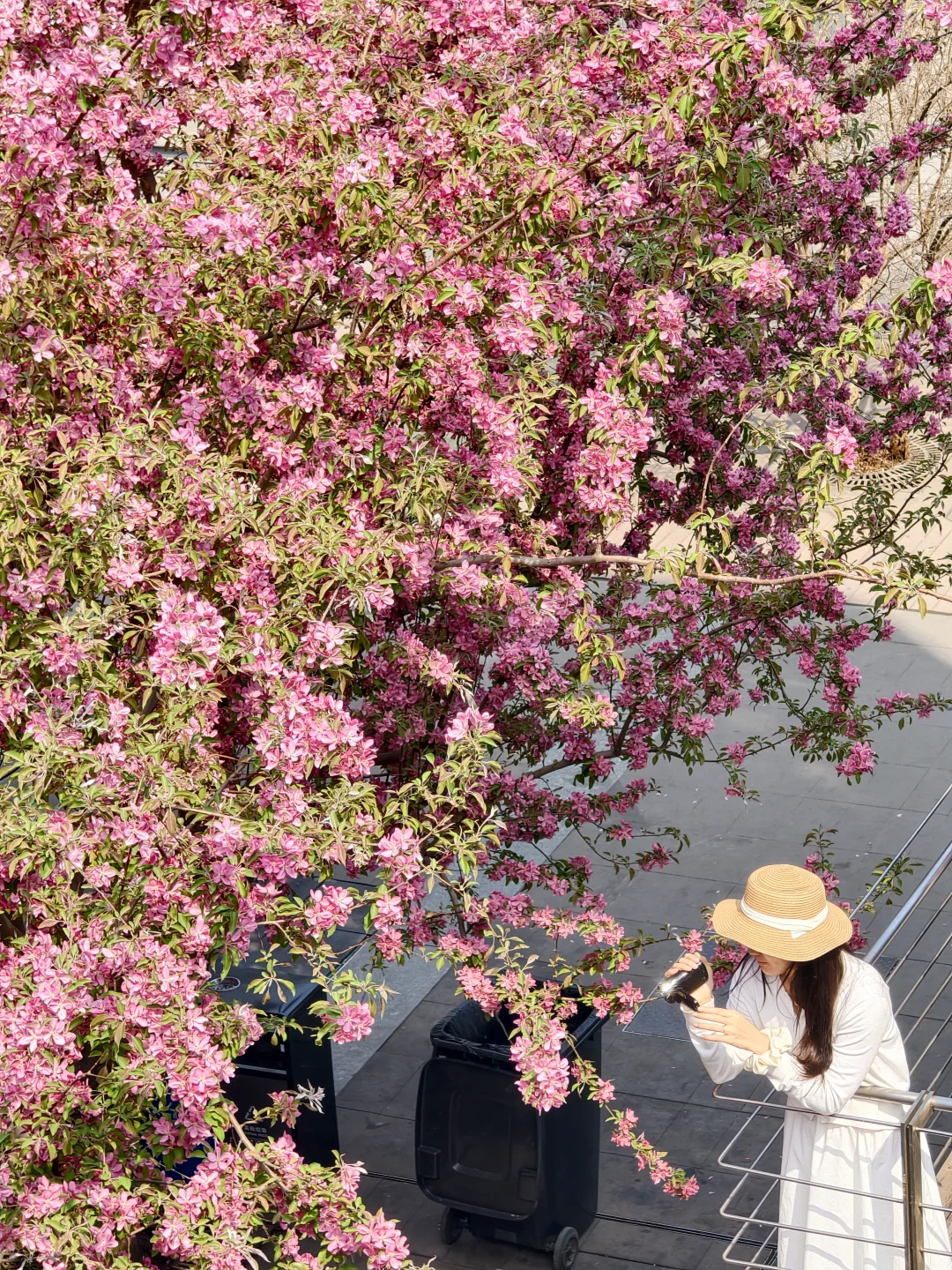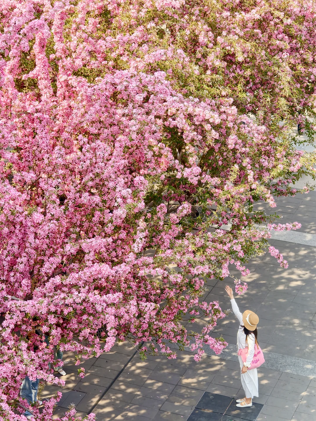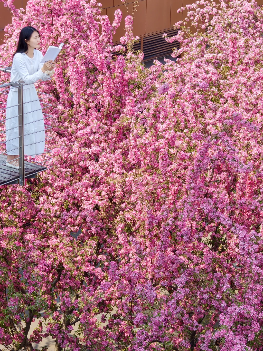站在三层平台,整片粉色花海当背景,巨出片