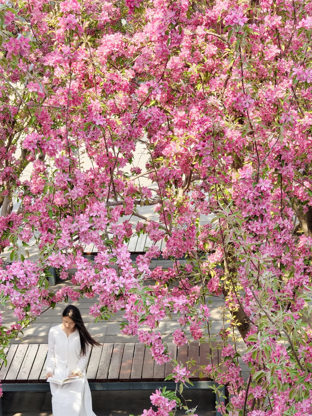 坐在花下,阳光透过花瓣洒下来,怎么拍都温柔