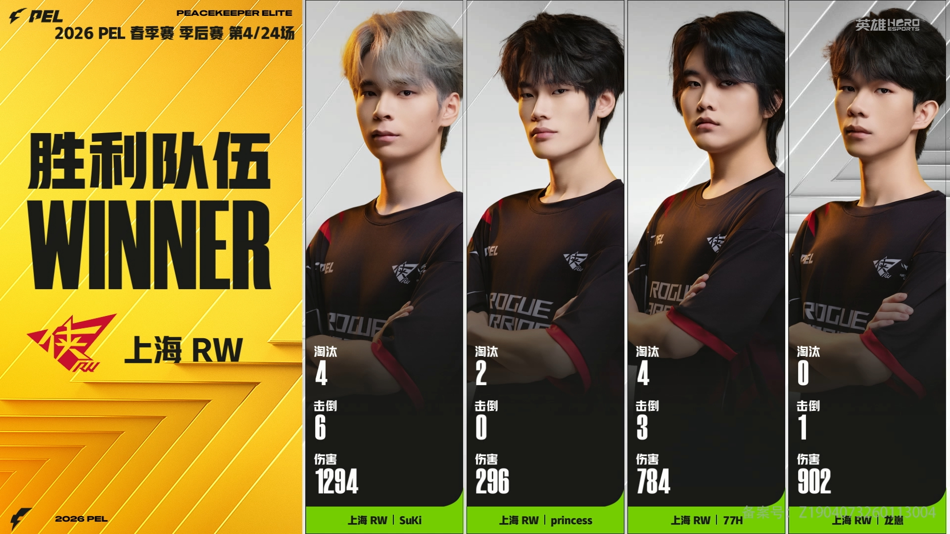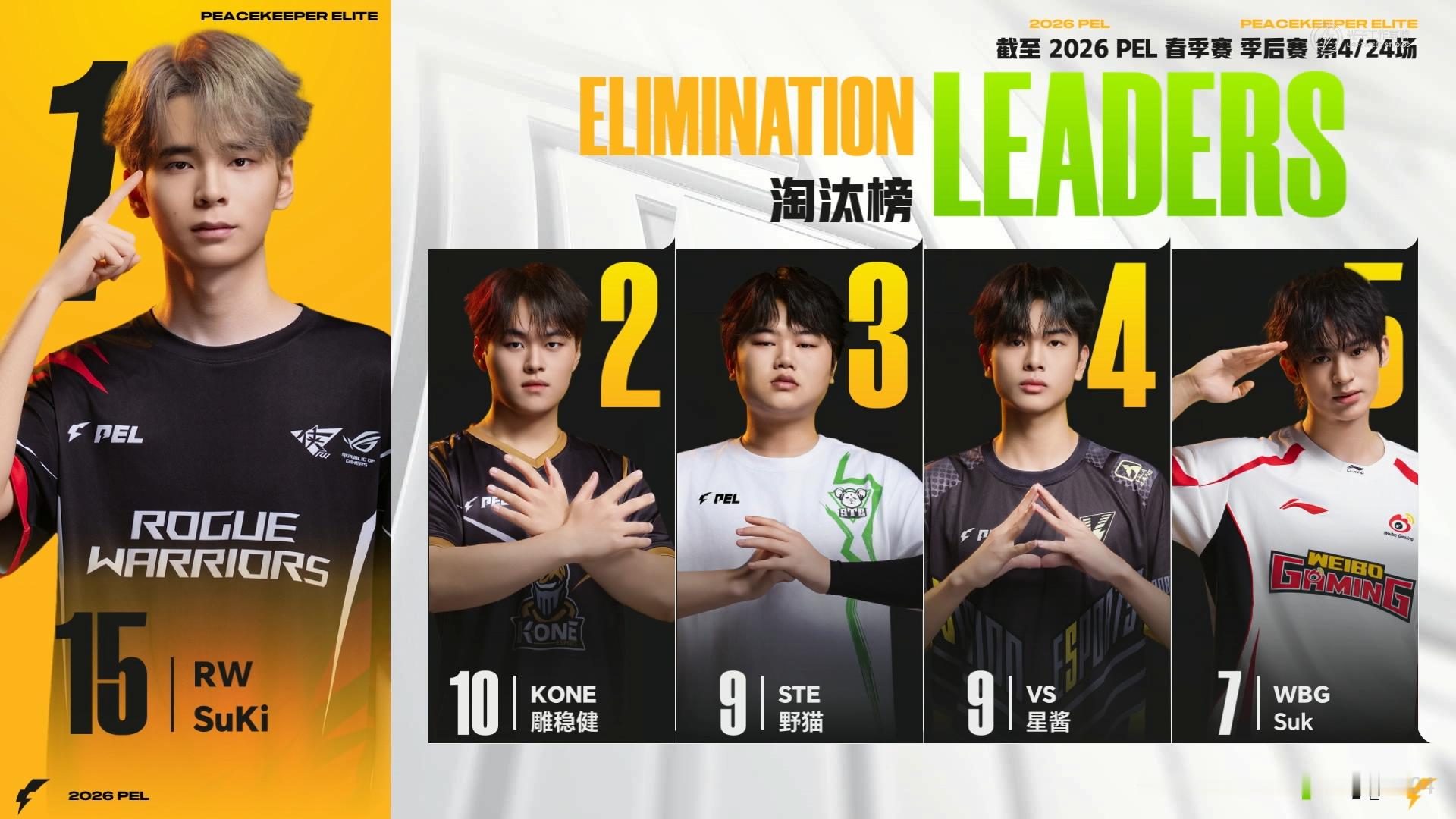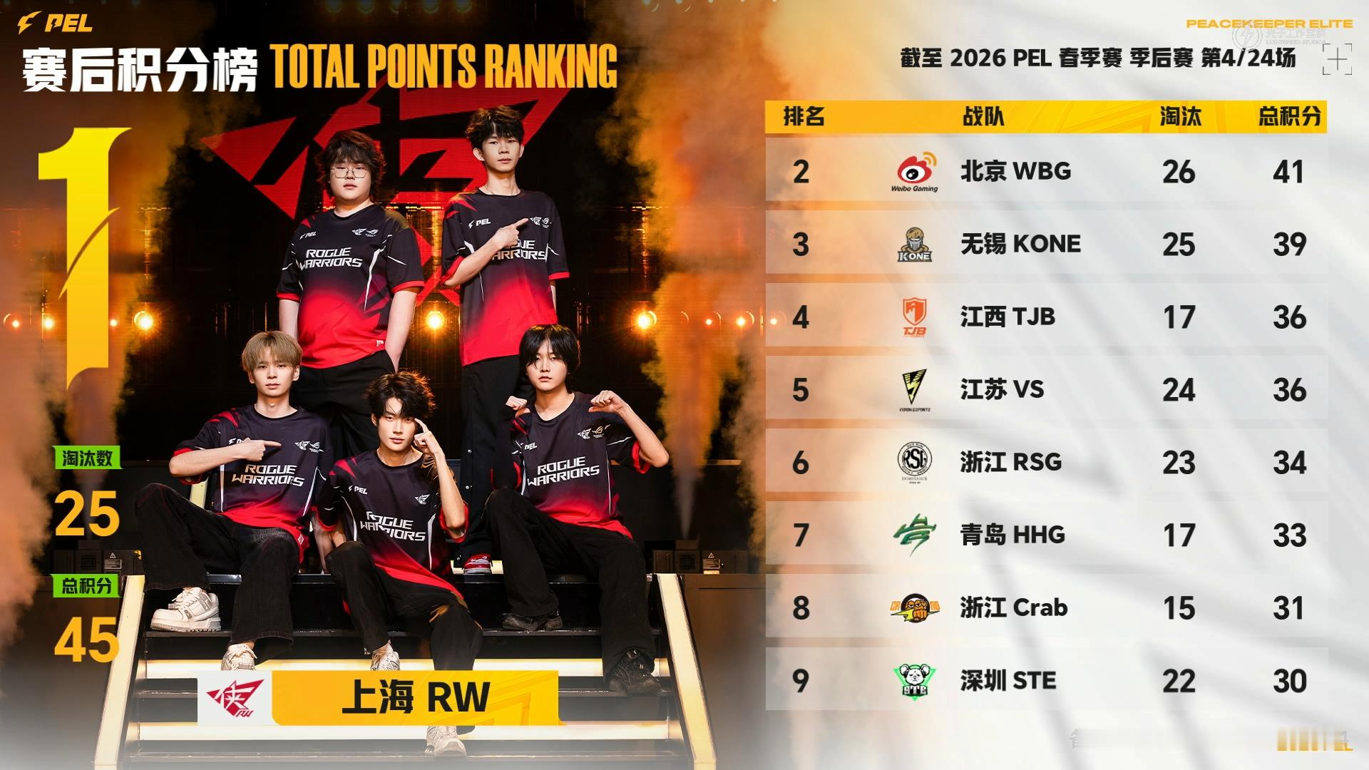 RW满编吃下一鸡 季后赛淘汰榜更新!RW战队满编吃鸡火力全开,每一次淘汰都是实力