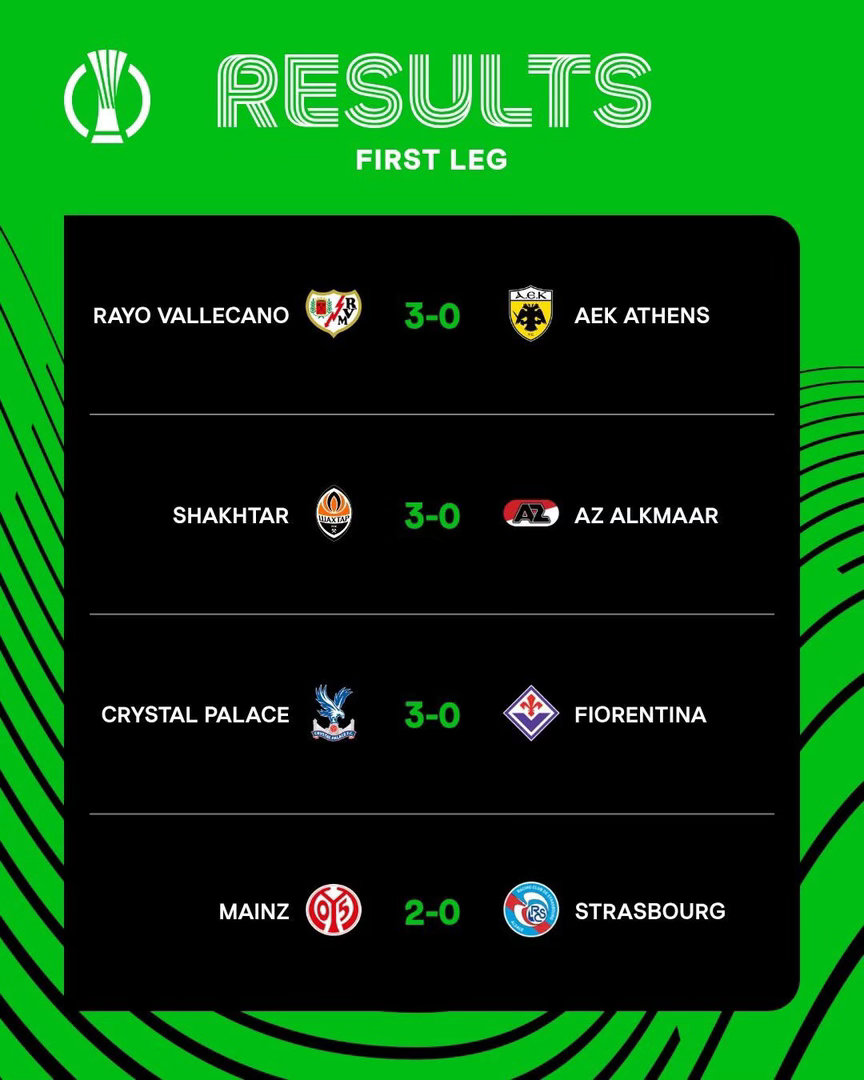 歐洲協會聯賽1/4決賽首回合賽事賽果-華歷簡奴3-0 AEK雅典水晶宮3-0 費倫天拿緬恩斯2-0 史特拉斯堡薩克達3-0 艾克馬亞