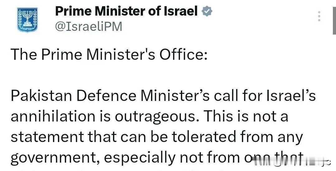 “巴基斯坦国防部长呼吁消灭以色列,这种言论令人发指。任何政府都无法容忍这种言论,更何况是一个自诩为和平中立仲裁者的政府。”