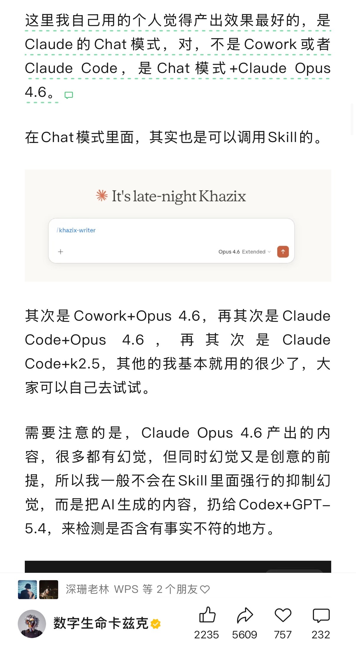 前两天刷到数字生命卡兹克的一条内容,他说了一句话,大意是,他自己用下来觉得产出效果最好的组合,是Claude的Chat模式+Opus 4.6。