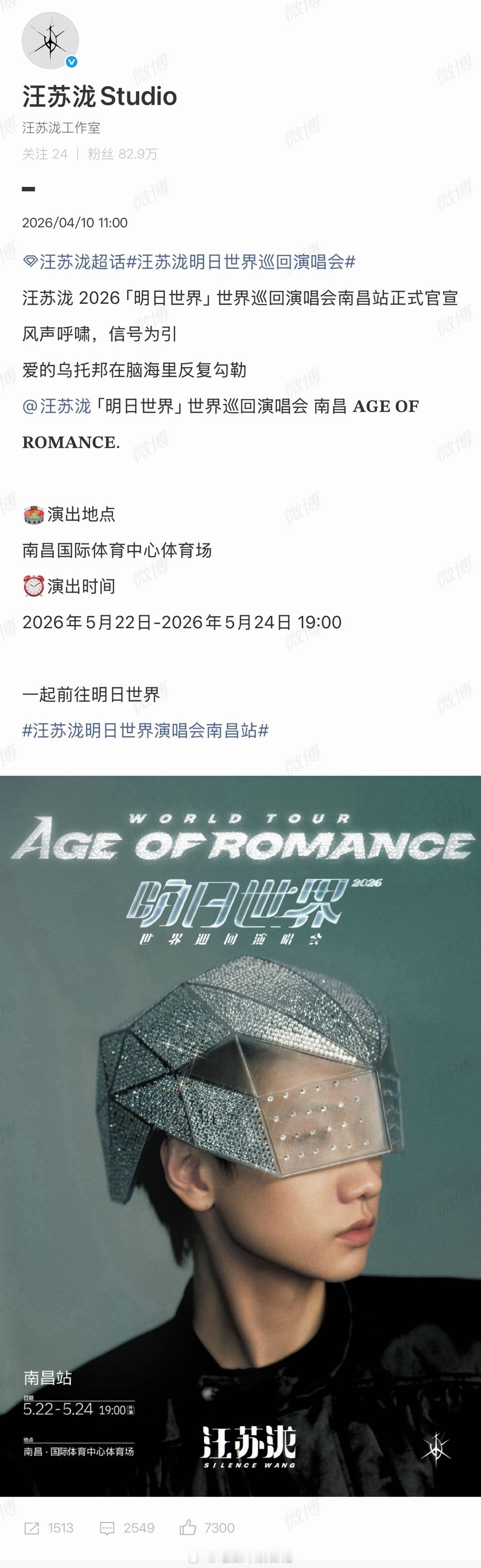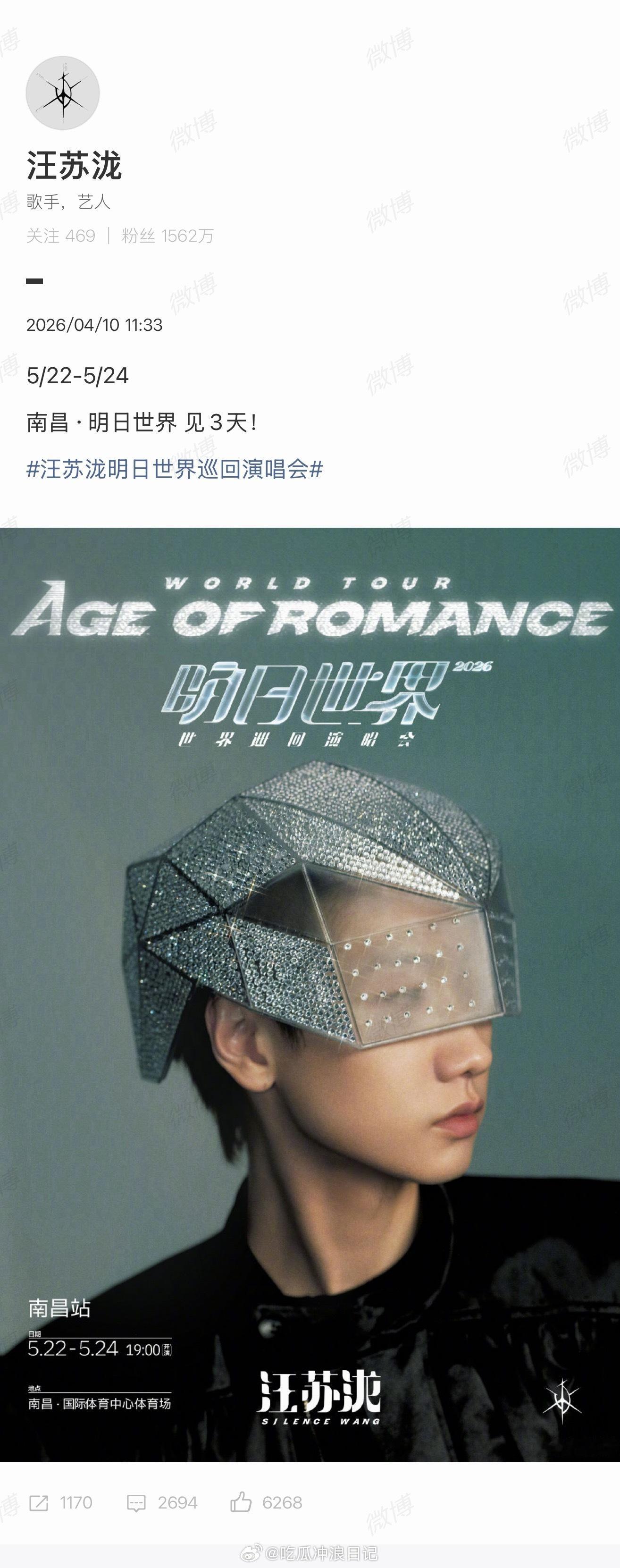汪苏泷演唱会官宣南昌站 汪苏泷明日世界官宣南昌站啦!!!南昌可以提前热闹起来了,赣江的浪、滕王阁的檐、绳金塔的夜,都准备好迎接这场演唱会了!5.22-5.24连开三天,一边是南昌热辣辣的烟火气,一边是陪伴整个青春里的泷式情歌,光是想想就很激动了,在晚风里和万人一起大合唱的时刻会多幸福啊