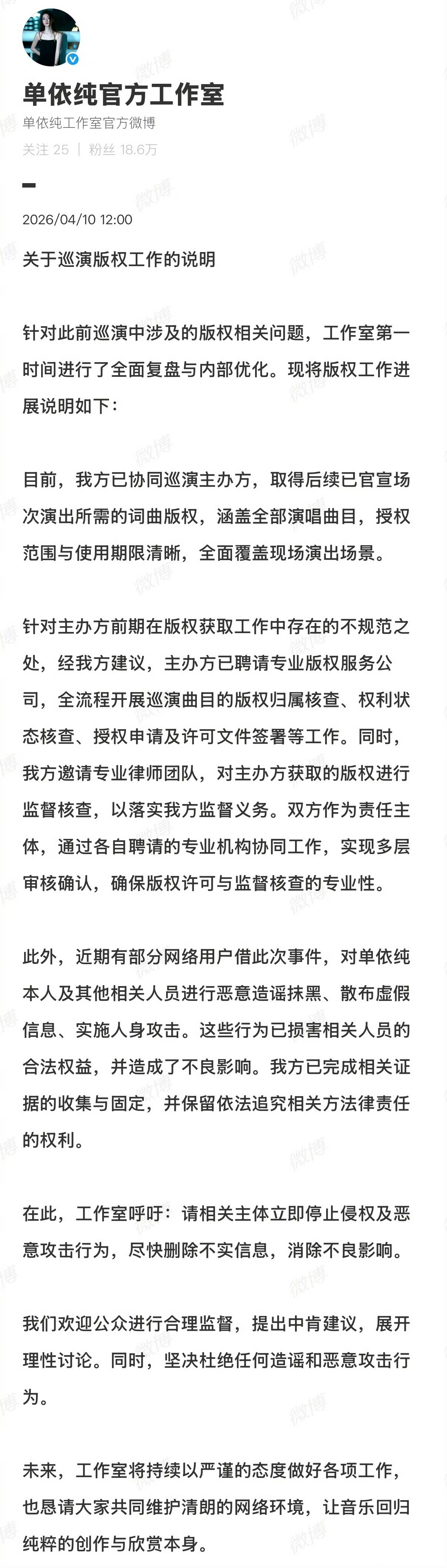 单依纯工作室发了关于巡演版权的工作的说明单依纯方发布巡演版权工作说明单依纯方已取