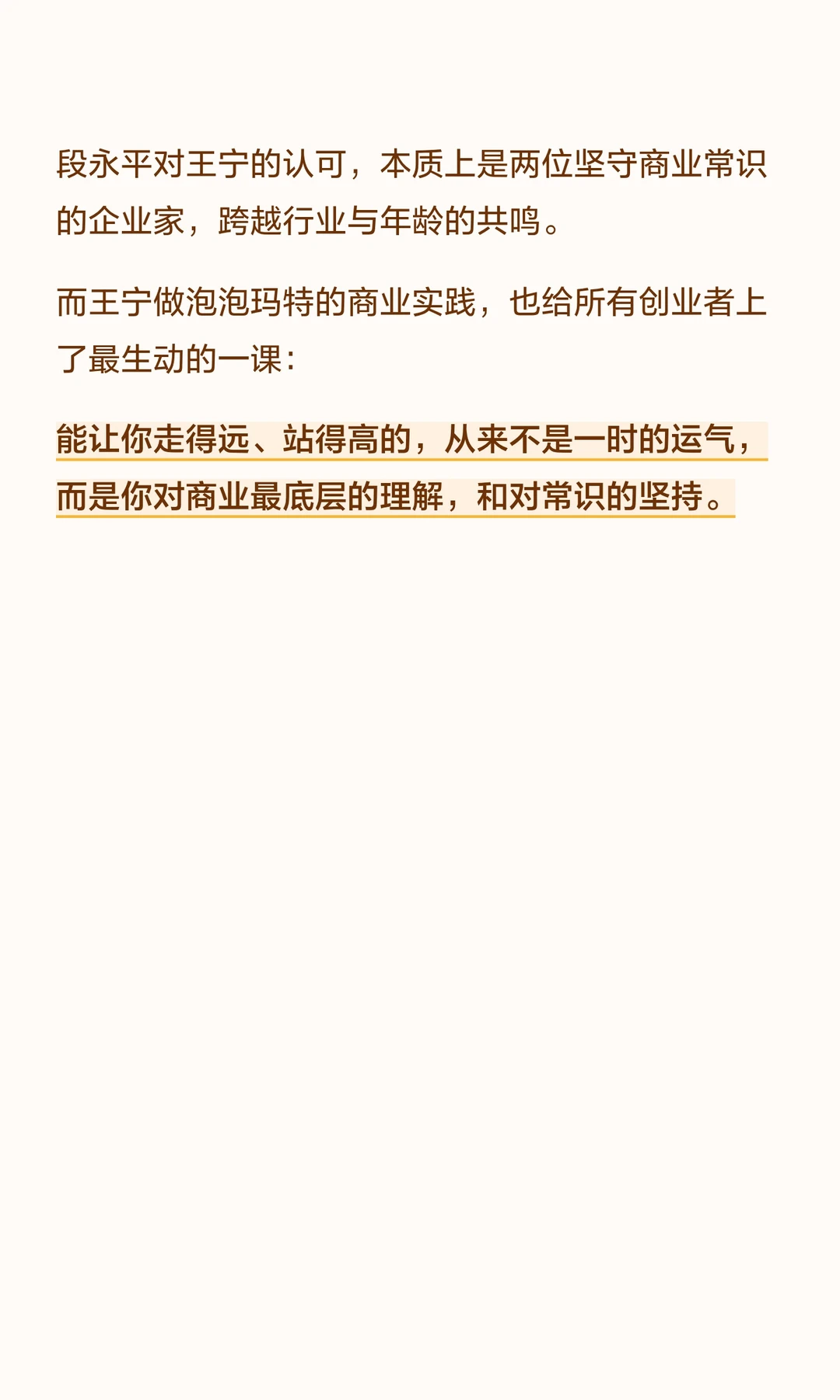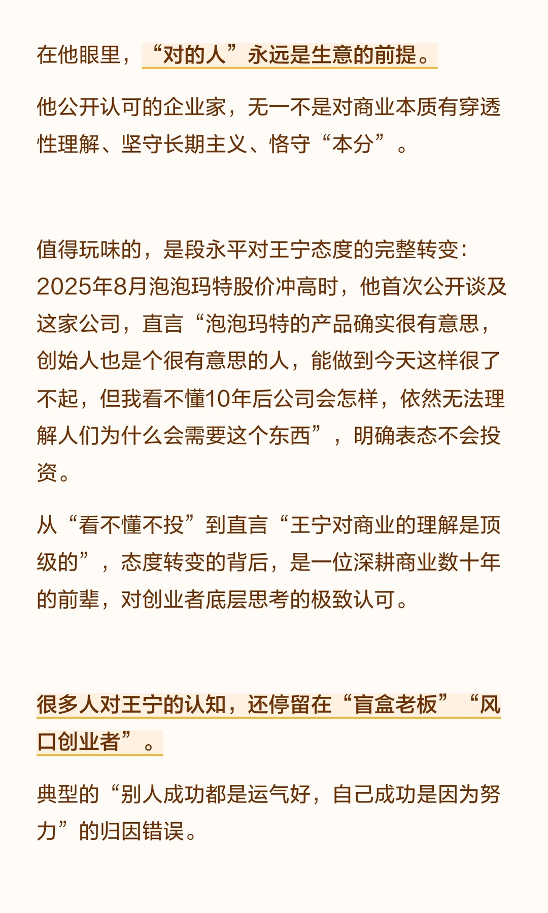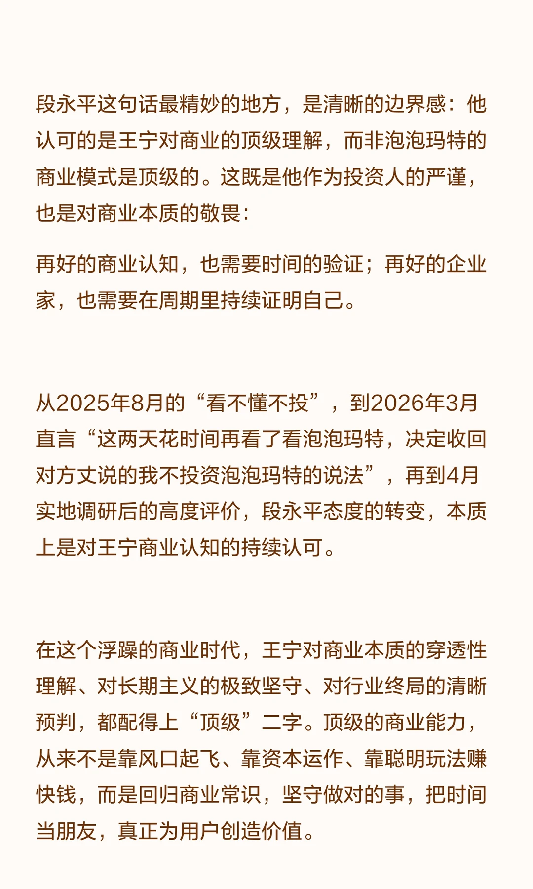 2026年4月,投资大佬段永平在雪球说:“我说的是王宁对商业的理解是顶级的,从没说过他们的商业模式是顶级的”。