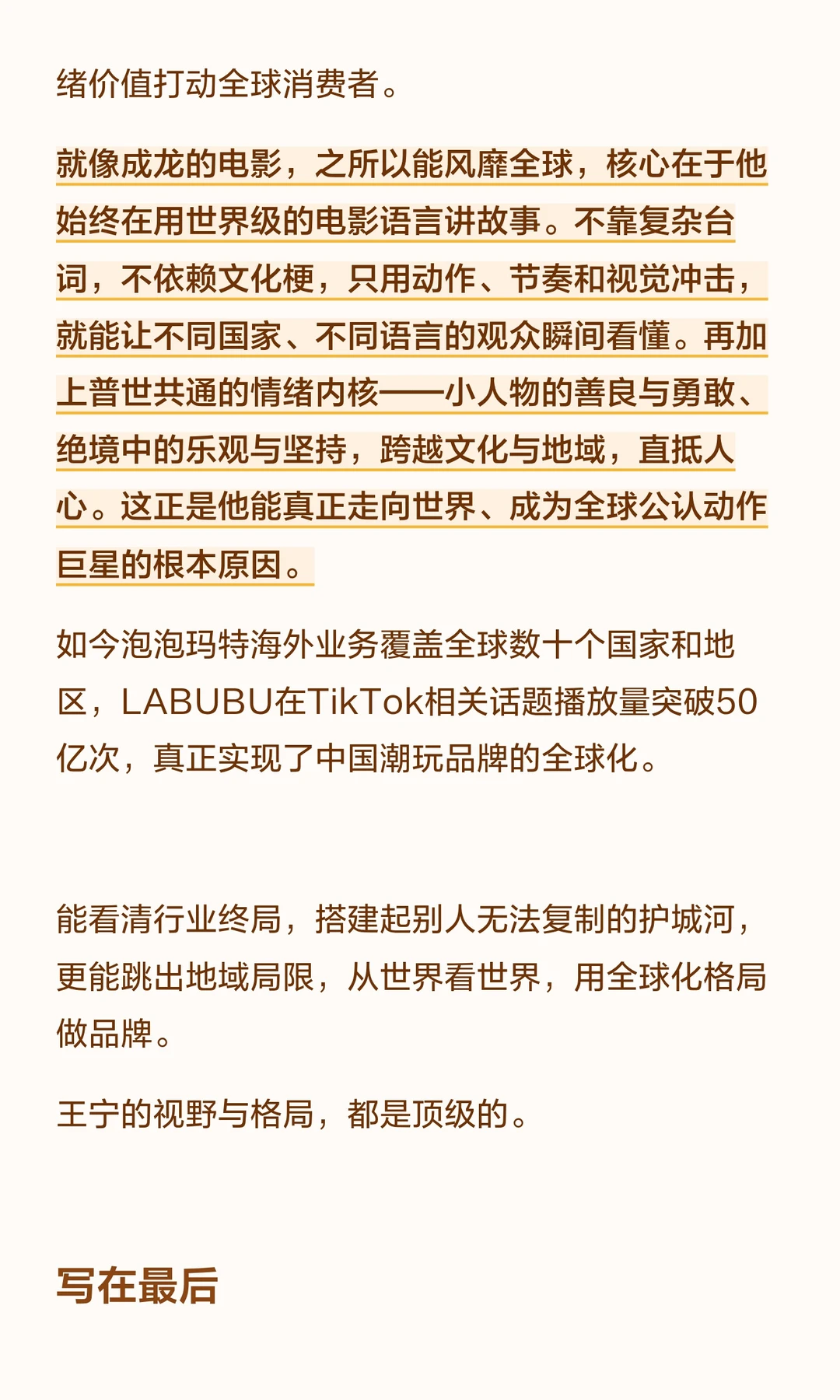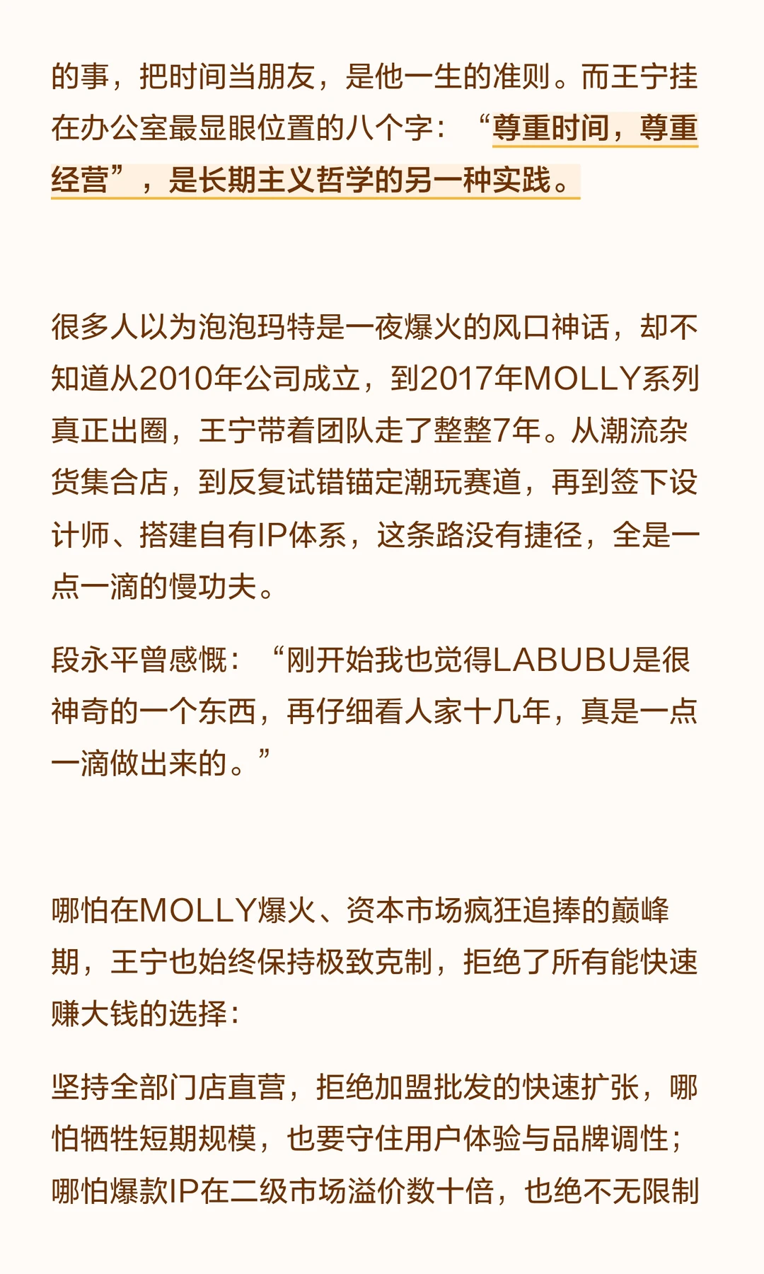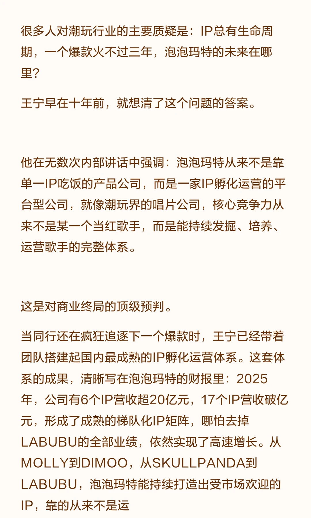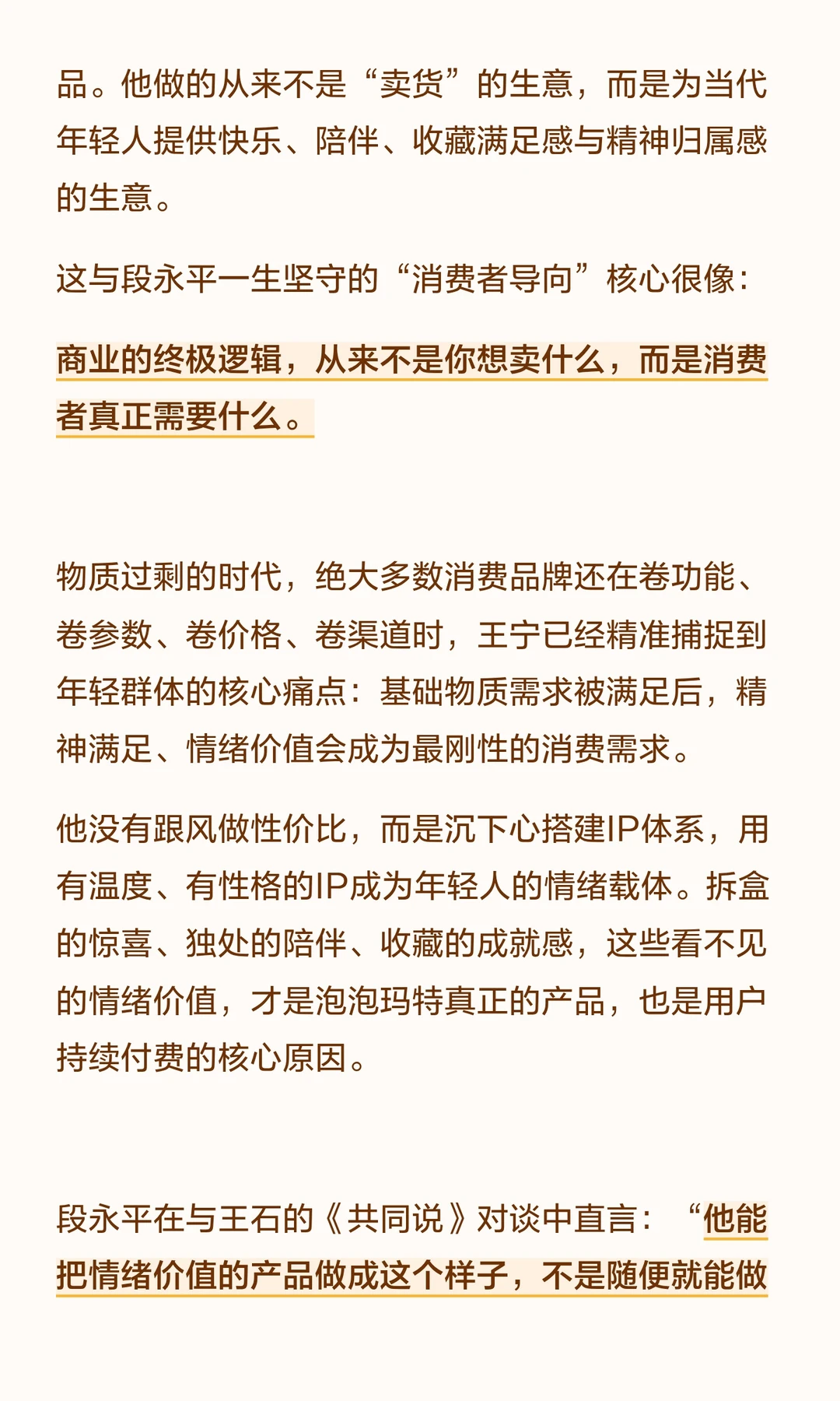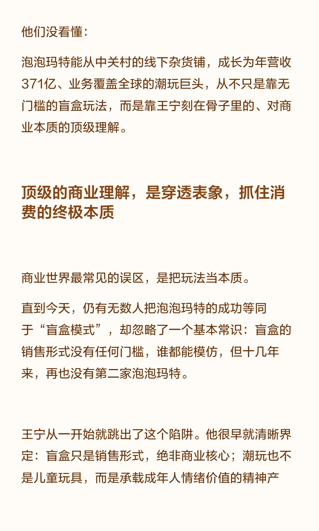泡泡玛特能从中关村的线下杂货铺,成长为年营收371亿、业务覆盖全球的潮玩巨头,从不只是靠无门槛的盲盒玩法,而是靠王宁刻在骨子里的、对商业本质的顶级理解。