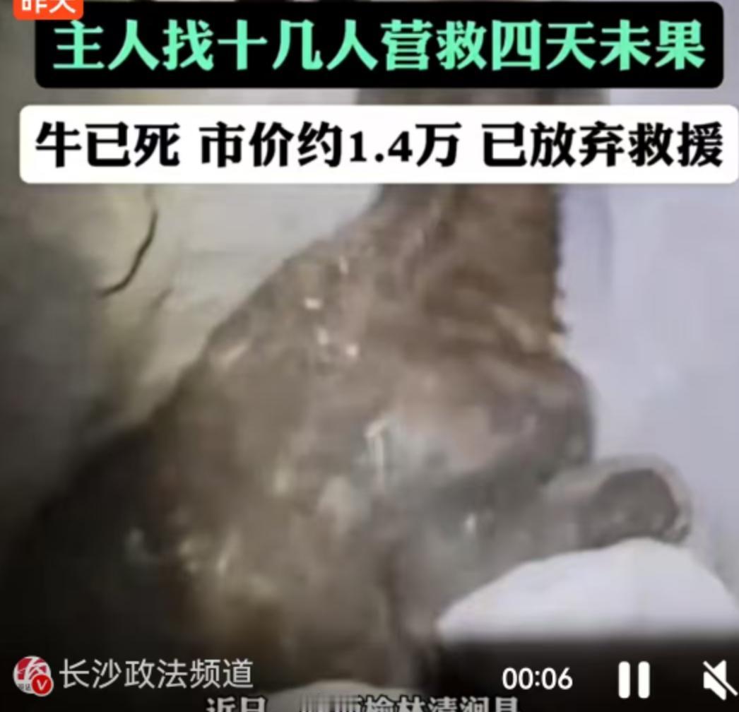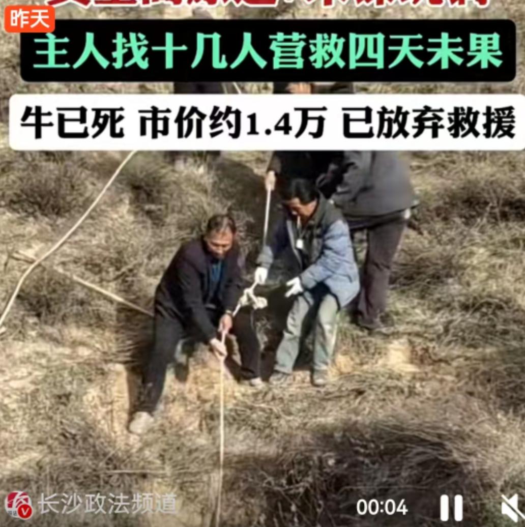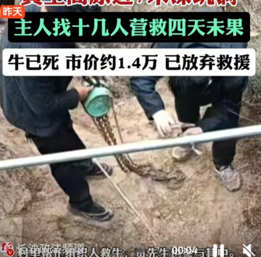 新闻中提到,牛主人营救了4天4夜。这4天里,他肯定想尽了各种办法,也经历了从“一定要救活”到“能把尸体弄上来卖钱/吃肉”再到“只能放弃”的心理落差。