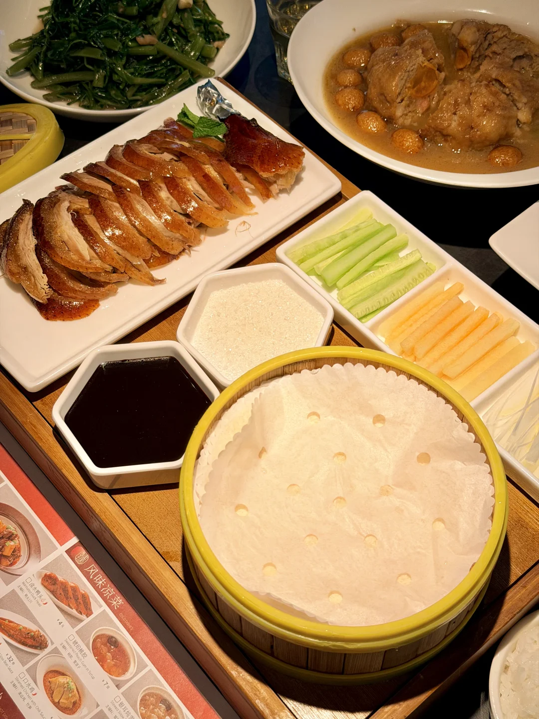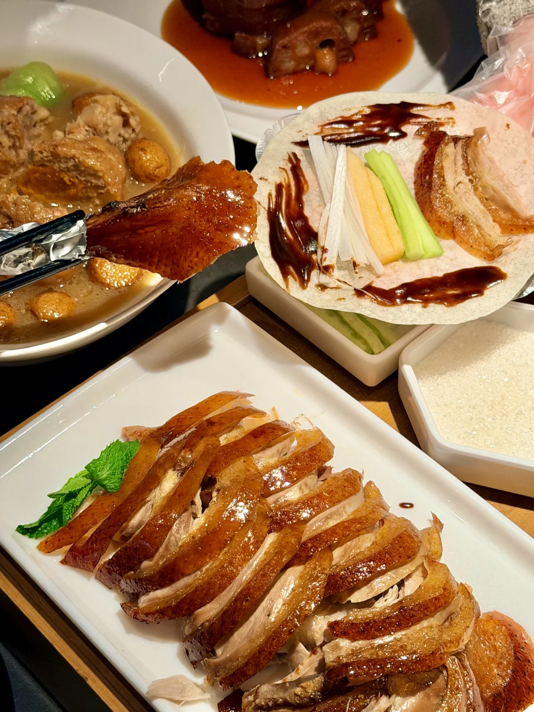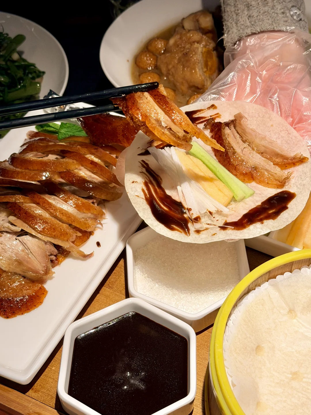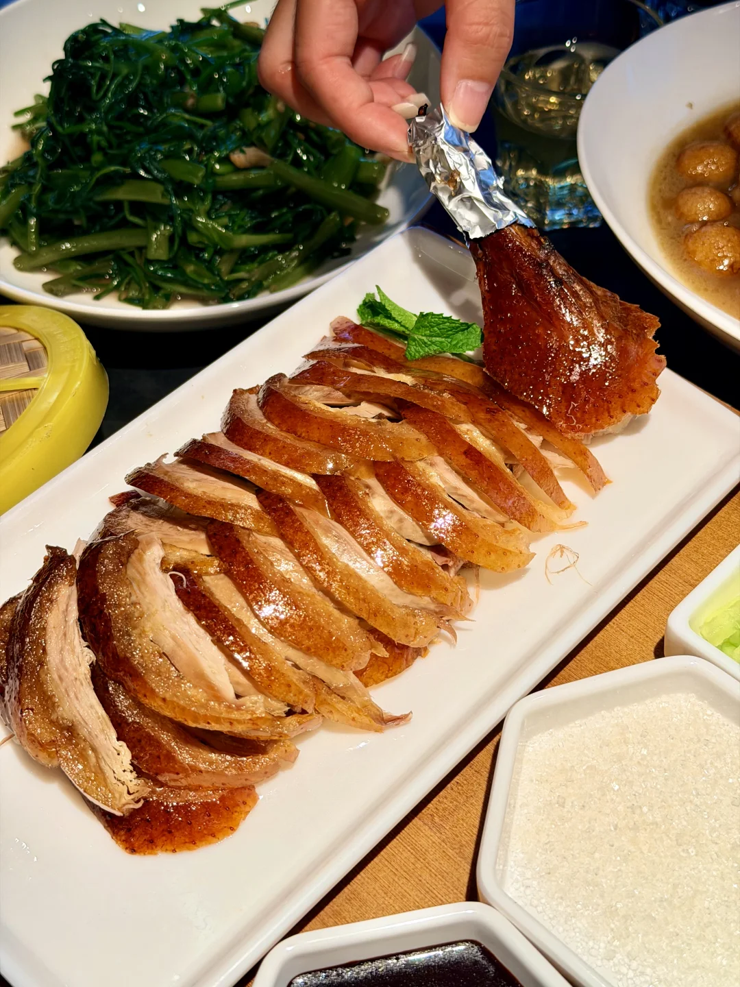 现片的鸭皮金黄酥脆,咬下去直接“咔滋”爆香,鸭肉嫩到抿嘴就化!卷饼的葱丝、黄瓜丝和甜酱给得超足,裹着鸭肉一口咬下去,鲜香油润的口感完全不输香港中环的浙菜馆,连鸭架都能做成椒盐款,香到舔手指!