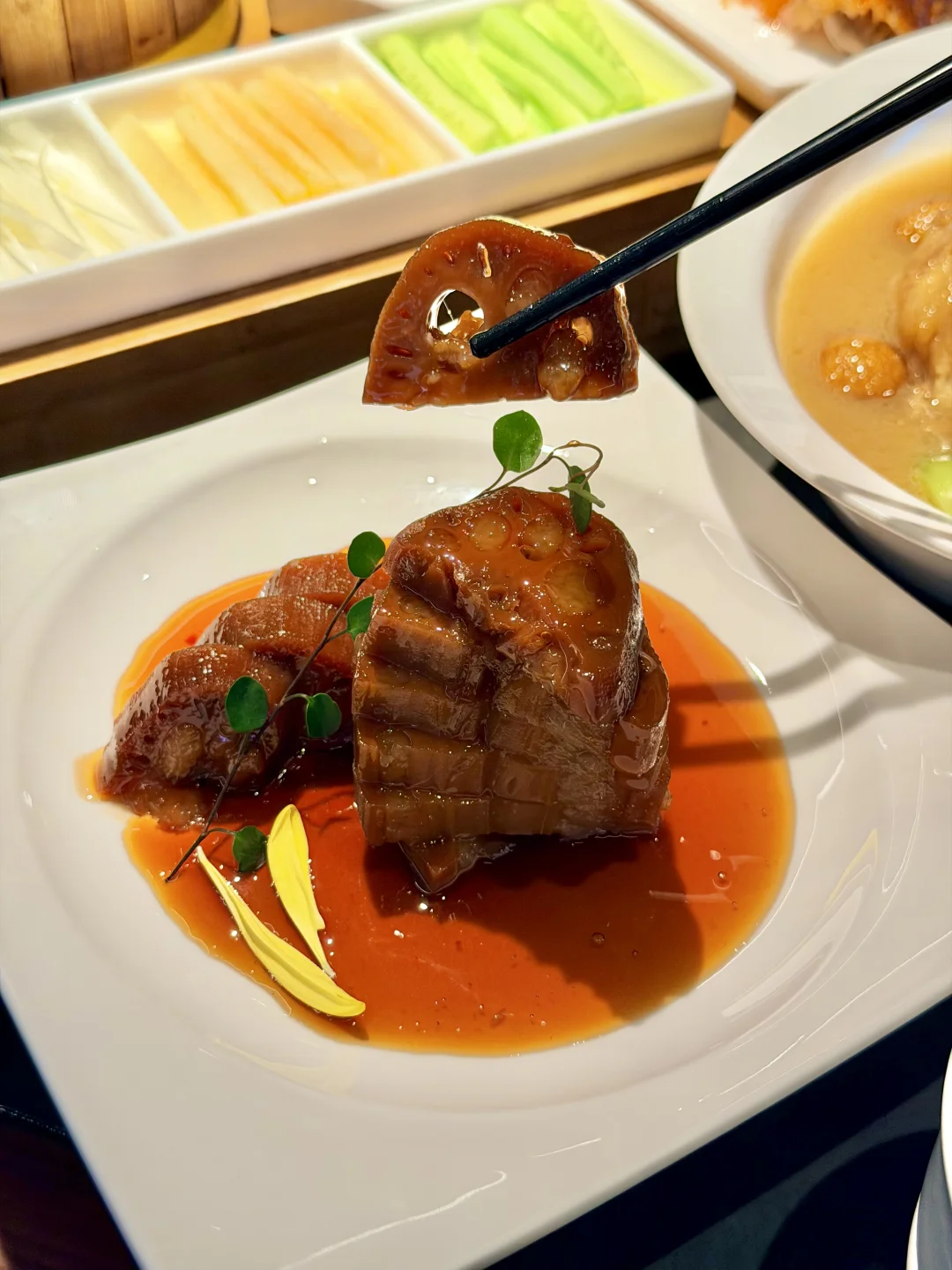 港漂真的超爱这道甜口菜!粉糯的莲藕塞满了饱满糯米,裹着清甜的糖汁,甜而不齁还带着淡淡的藕香,吃完重口的烤鸭和狮子头,咬一口藕韵瞬间解腻,是江南独有的温柔口感,饭后吃也毫无负担~