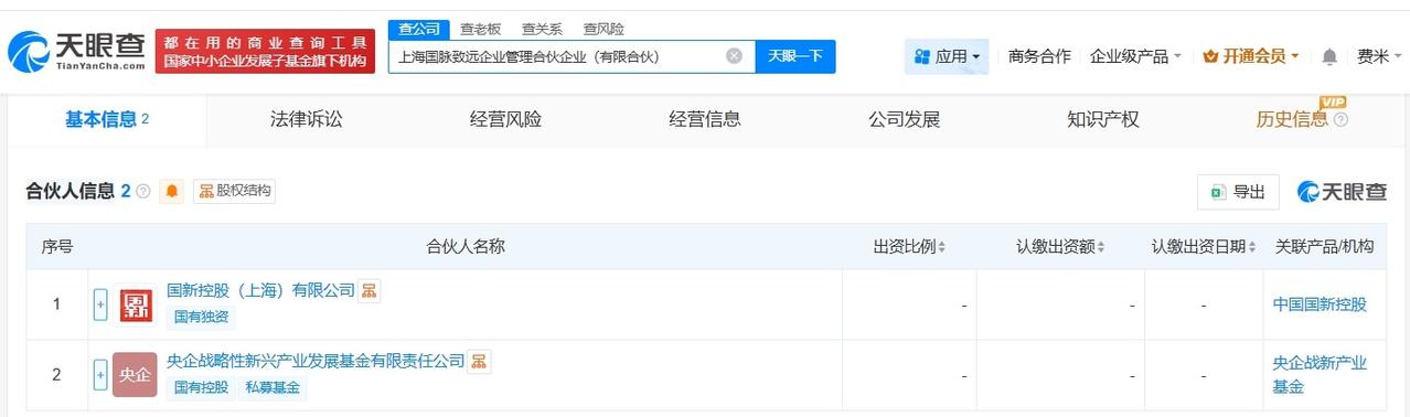 天眼查App显示,4月10日,上海国脉致远企业管理合伙企业(有限合伙)成立,执行事务合伙人为国新控股(上海)有限公司,出资额2.02亿人民币,经营范围包括企业管理、企业管理咨询、会议及展览服务等。合伙人信息显示,该合伙企业由国新控股(上海)有限公司、央企战略性新兴产业发展基金有限责任公司共同出资。