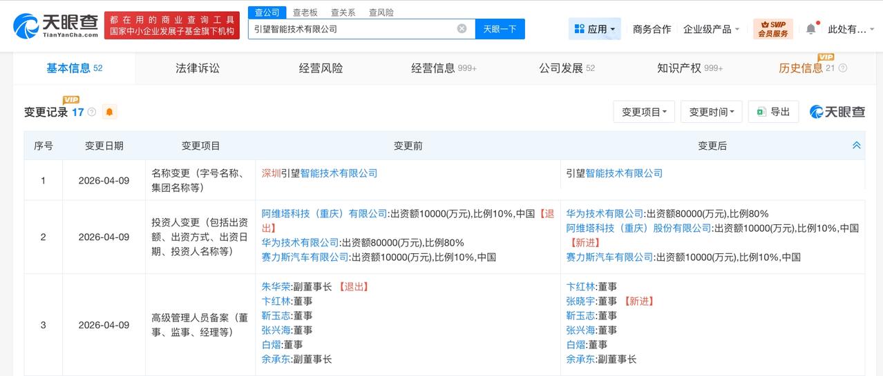天眼查App显示,近日,深圳引望智能技术有限公司发生工商变更,企业名称变更为引望智能技术有限公司,朱华荣卸任副董事长,新增张晓宇为董事。