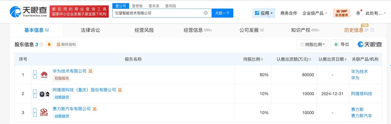 该公司成立于2024年1月,法定代表人为徐直军,注册资本10亿人民币,经营范围含智能车载设备制造、智能车载设备销售、汽车零部件研发、人工智能行业应用系统集成服务、人工智能基础软件开发、人工智能理论与算法软件开发等。股东信息显示,该公司由华为技术有限公司、阿维塔科技(重庆)股份有限公司、赛力斯汽车有限公司共同持股。
