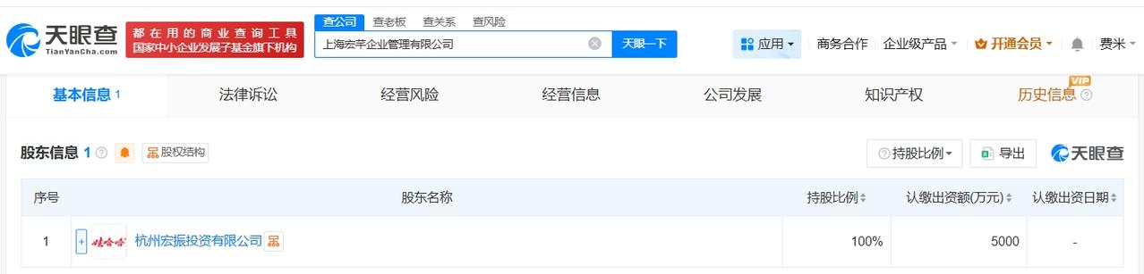 天眼查App显示,4月10日,上海宏芊企业管理有限公司成立,法定代表人为宗馥莉,注册资本5000万人民币,经营范围包括企业管理、企业管理咨询、社会经济咨询服务等,由杭州宏振投资有限公司全资持股,后者由宗馥莉全资持股。