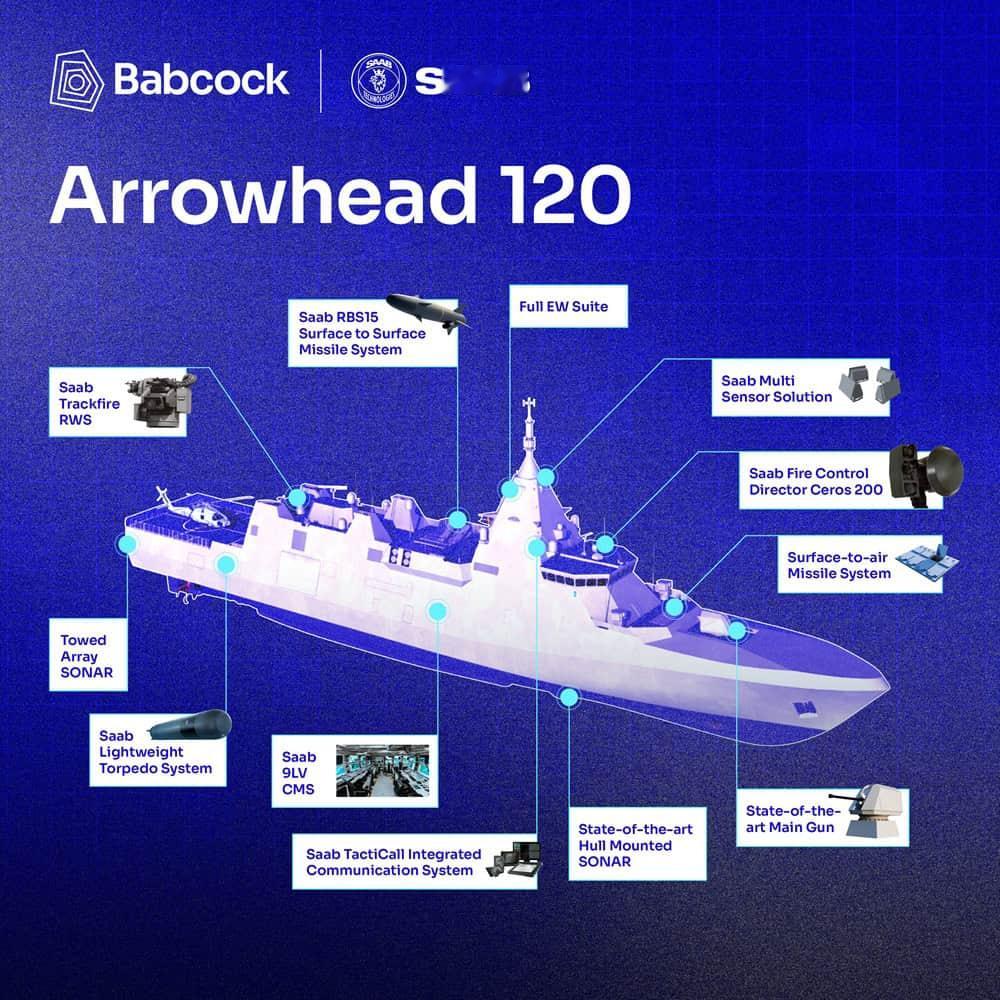 中外舰闻 烽火问鼎计划 每天认识一件兵器 英国🇬🇧Babcock上线“箭头”Arrowhead 120的官网(图1),传送门👉网页链接,确认了主武器是包含了Sea Ceptor(CAMM)和Aster导弹的多层防空系统(图2,红色高亮的方框内)。官网上同时还有这张之前曝光过的Infographic(图3)。