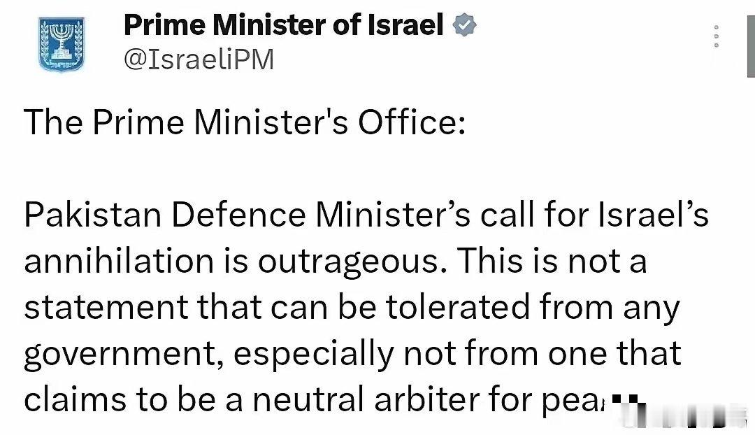 巴基斯坦替伊朗出头了,防长称以色列为“癌症国家”,内塔尼亚胡暴怒! 巴基斯坦国防部长哈瓦贾·阿西夫公开怒怼以色列,直言其是″人类的祸害与诅咒″,更是将其称作″扎根巴勒斯坦的癌症国家″,甚至诅咒当年推动建国的相关人群″在地狱腐烂″,这番狠话直接引爆舆论,内塔尼亚胡政府当场暴怒反击。 当下巴基斯坦正以中立调解方身份,在伊斯兰堡牵头美伊和平谈判,全力推动中东停火。可以色列全然不顾和平进程,持续在黎巴嫩发动军事打击,制造平民伤亡,还接连在加沙、伊朗等地制造流血事件,彻底激怒巴方。 阿西夫怒斥以色列在黎巴嫩实施种族灭绝,战火从加沙蔓延至伊朗、黎巴嫩,无辜平民不断惨死,而伊斯兰堡为和平奔走的努力,被以方的暴行彻底践踏。作为伊斯兰大国,巴基斯坦此番强硬表态,既是声援伊朗与黎巴嫩,也道出了众多伊斯兰国家的愤怒。 以色列总理内塔尼亚胡迅速发声谴责,称巴防长言论煽动反犹仇恨、呼吁消灭以色列,令人发指。以方直指巴基斯坦身为调解方,发表极端言论违背中立立场,任何国家都无法容忍,双方隔空对骂,火药味十足。 有观点认为,以色列接连破坏停火、无视人道主义,遭到强烈谴责实属必然;也有声音提醒,巴基斯坦作为调解方,使用“癌症国家”“下地狱”等极端表述,容易激化矛盾,不利于劝和促谈。 此次外交对峙,让本就脆弱的中东和平进程再添变数。一边是巴基斯坦全力斡旋,一边是以色列持续动武,双方矛盾彻底公开化。后续局势如何发展,以色列是否会收敛暴行,巴基斯坦又是否会坚持强硬立场,牵动着整个中东的安全走向。