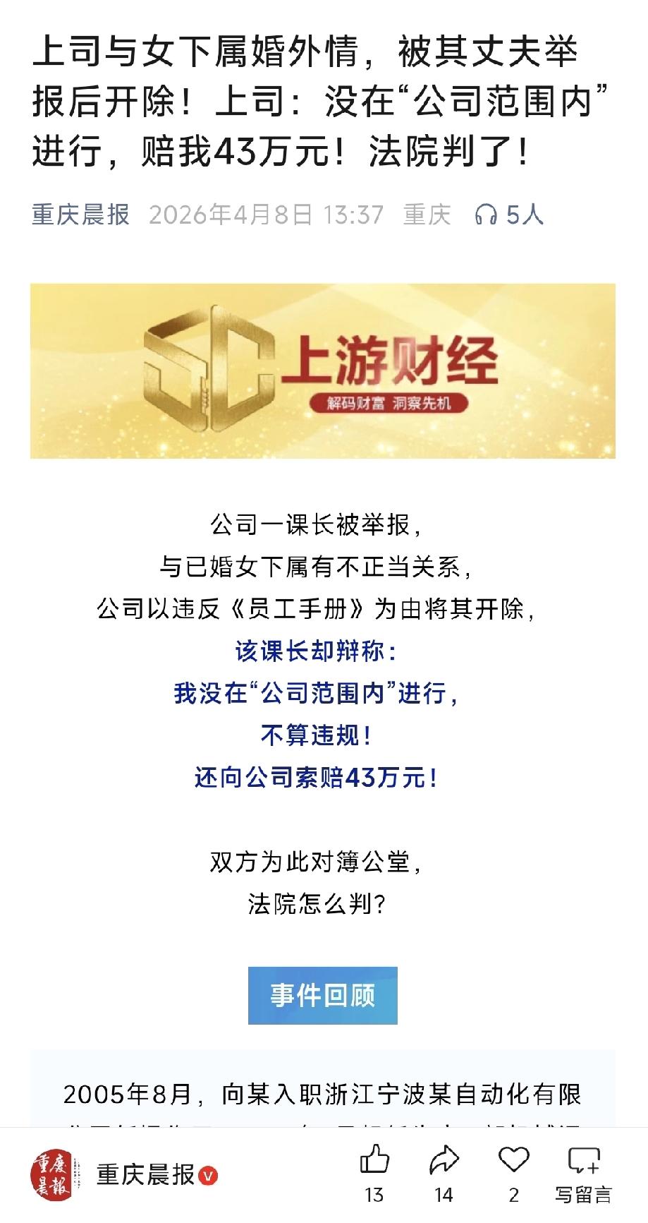 他的核心理由更是离谱:“我搞婚外情是我自己的私生活问题,又没在公司里发生,也没影响正常工作,公司凭什么开除我?”