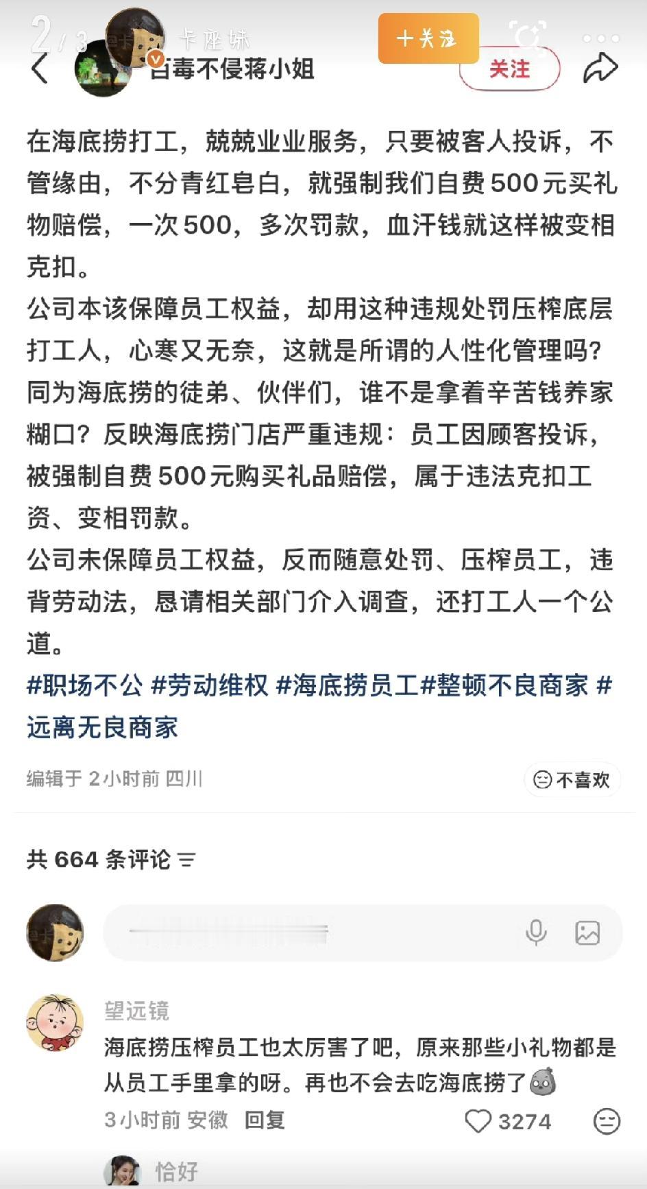 最近网上有个帖子,看得我心里直发凉。一位自称海底捞前员工的人爆料说:“海底捞送给客人的那些礼物,其实都是用员工的罚款买的。” 这话一出,简直像往火锅里扔了个鞭炮——海底捞那个“服务天花板”的人设,瞬间炸出了个大窟窿。