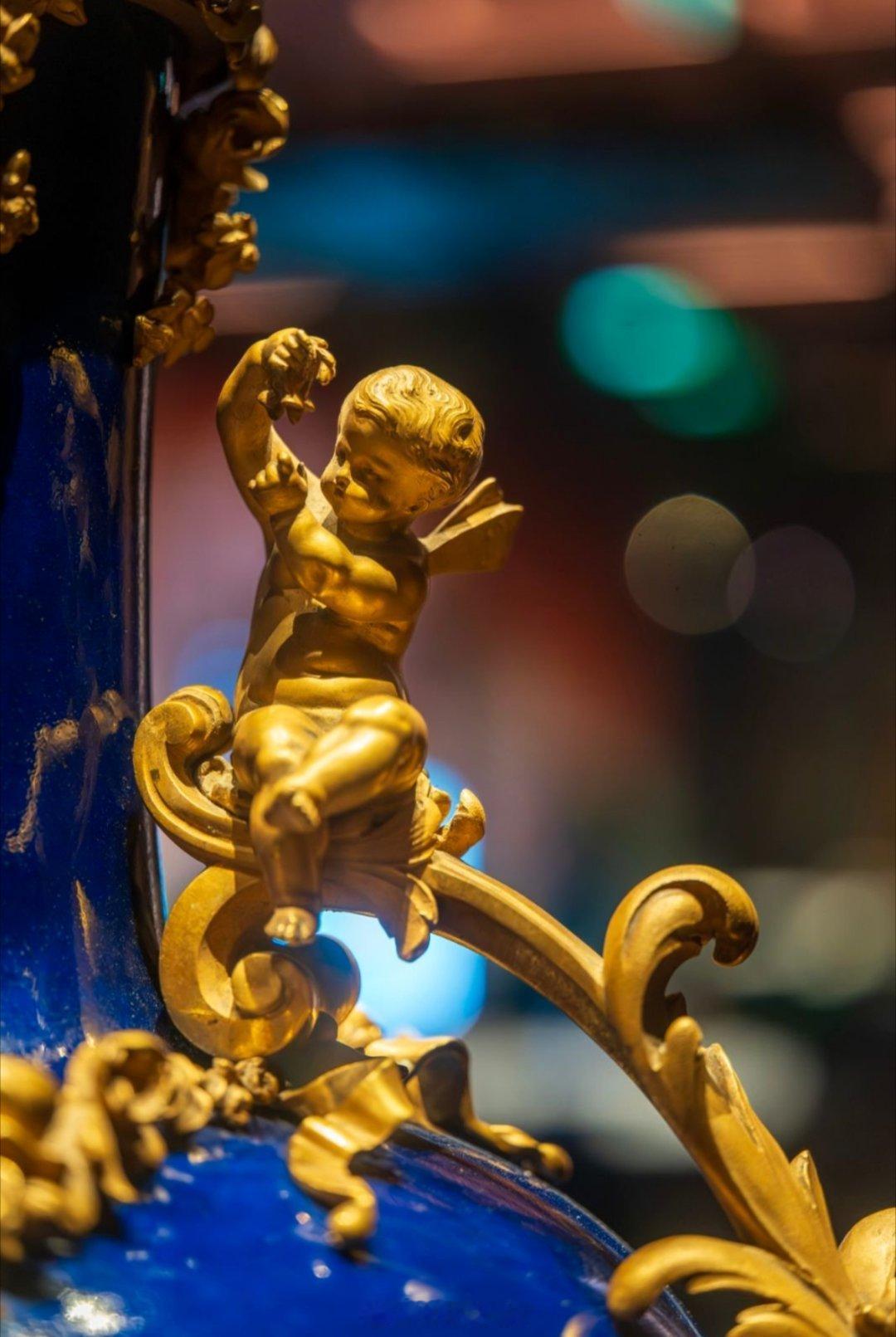 但是这件雍正时期的天球瓶可不一般,它除了使用雍正时期罕见的霁蓝釉,还采用了西方的天使等西洋铜饰。
