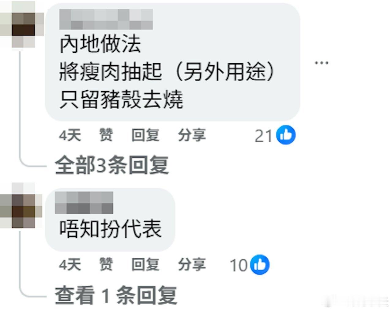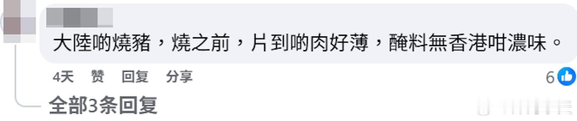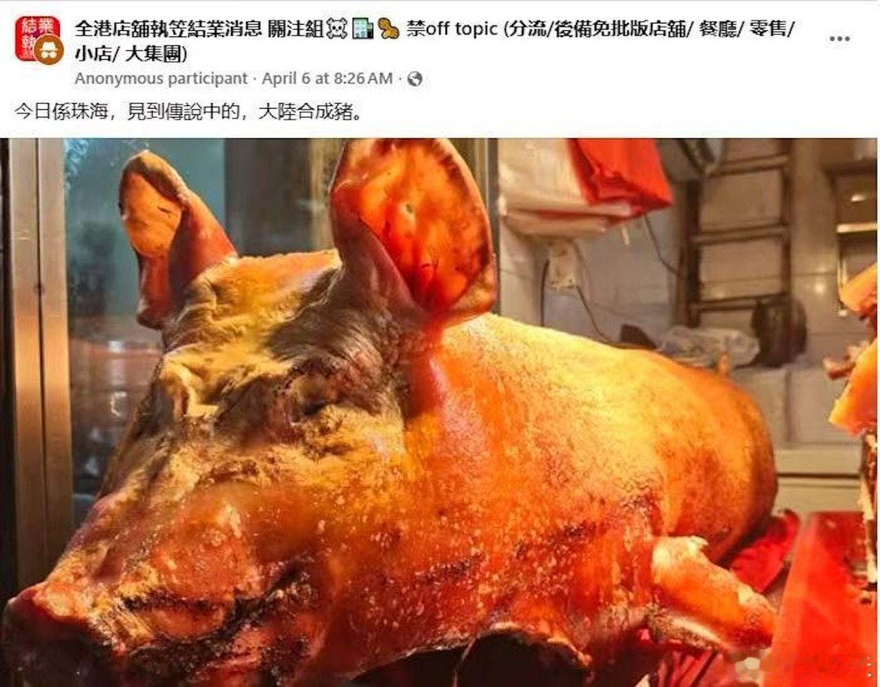 港人称内地烤猪为「合成猪」,评论区指贵过成猪近日,有港人在Facebook在「全
