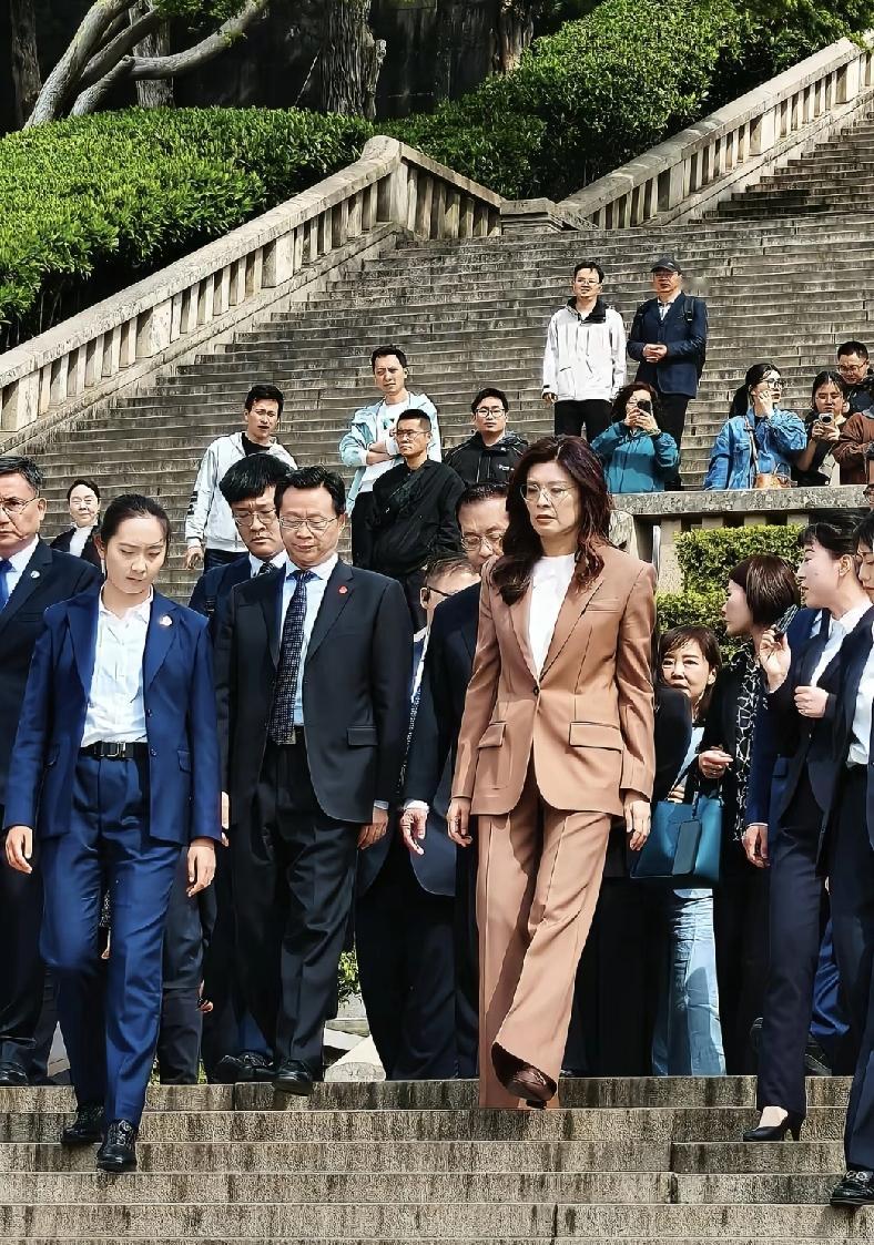 郑丽文这次来访,一头秀气的波浪披肩长发就足够时尚了,而在不同场合的西服套装更显得她潇洒干练,178的身高配上得体的西装,在一群男人中也显得气场强大,派头十足,真不愧是一党主席。