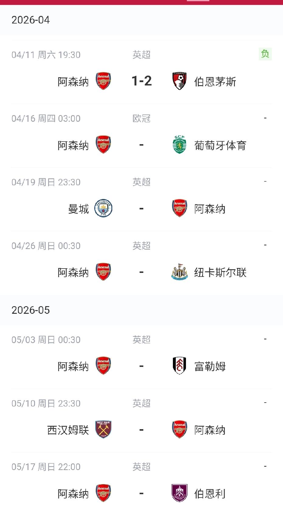 阿森纳1-2主场爆冷不敌伯恩茅斯,英超争冠悬念拉满!曼城少赛两场差9分,下周碰阿森纳。
