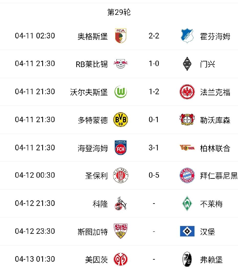 拜仁5-0大胜圣保利,最快下周可提前4轮夺冠!沃尔夫斯堡1-2不敌法兰克福,保级形势非常艰难。