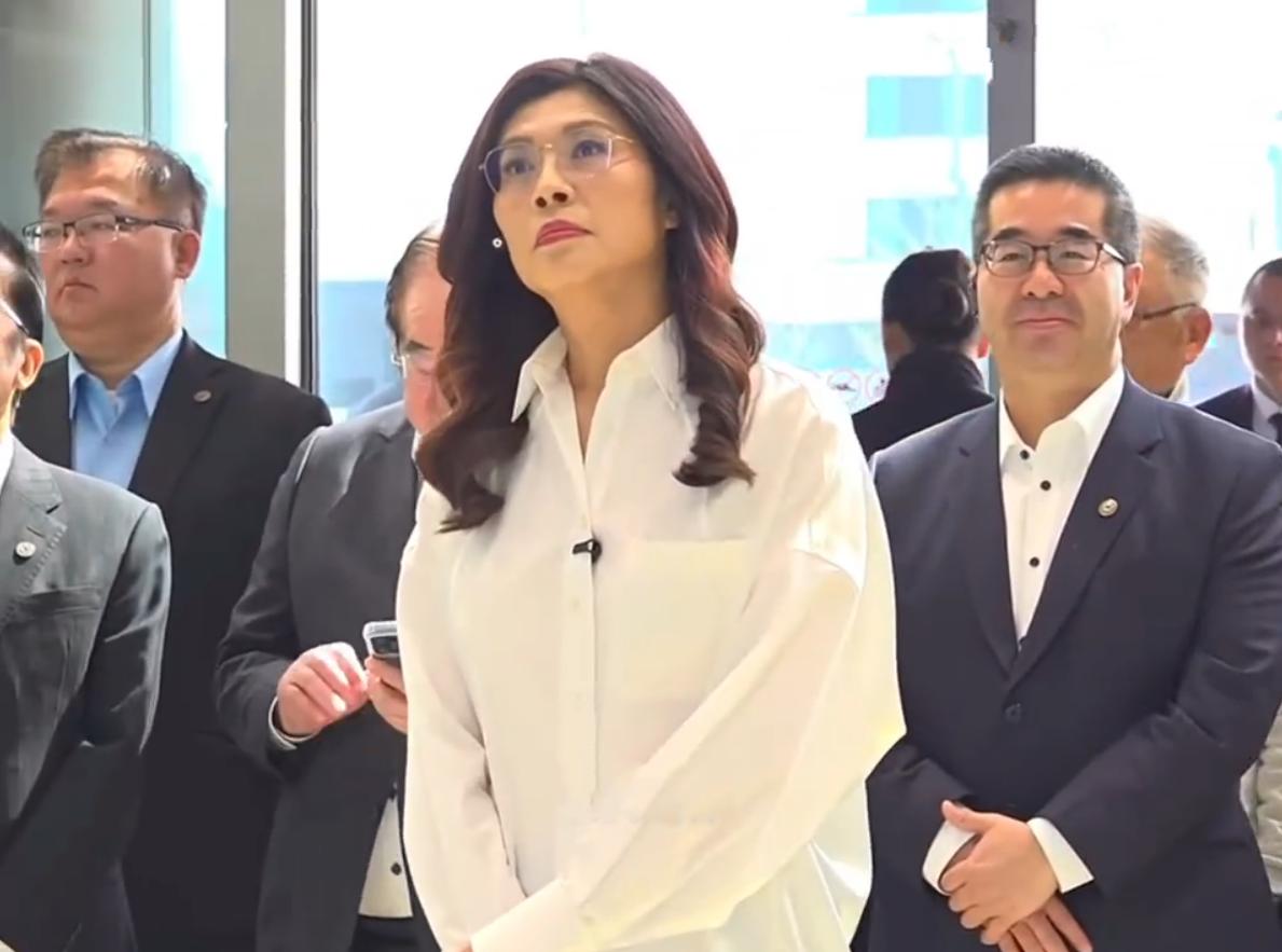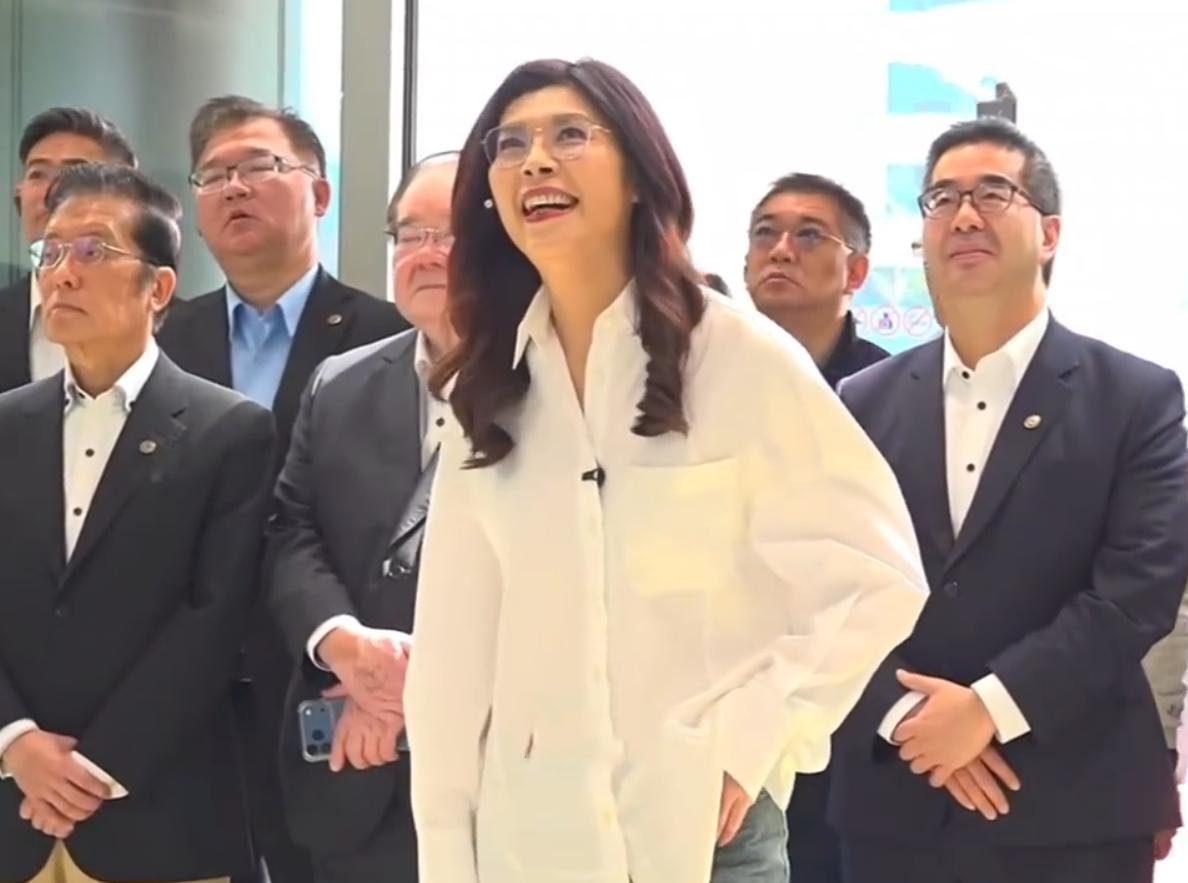 郑丽文看到一辆车说:“哇,那个车好漂亮”!还亲自坐在车上体验了一下,坐在车上对镜头点赞并配合媒体记者拍照。